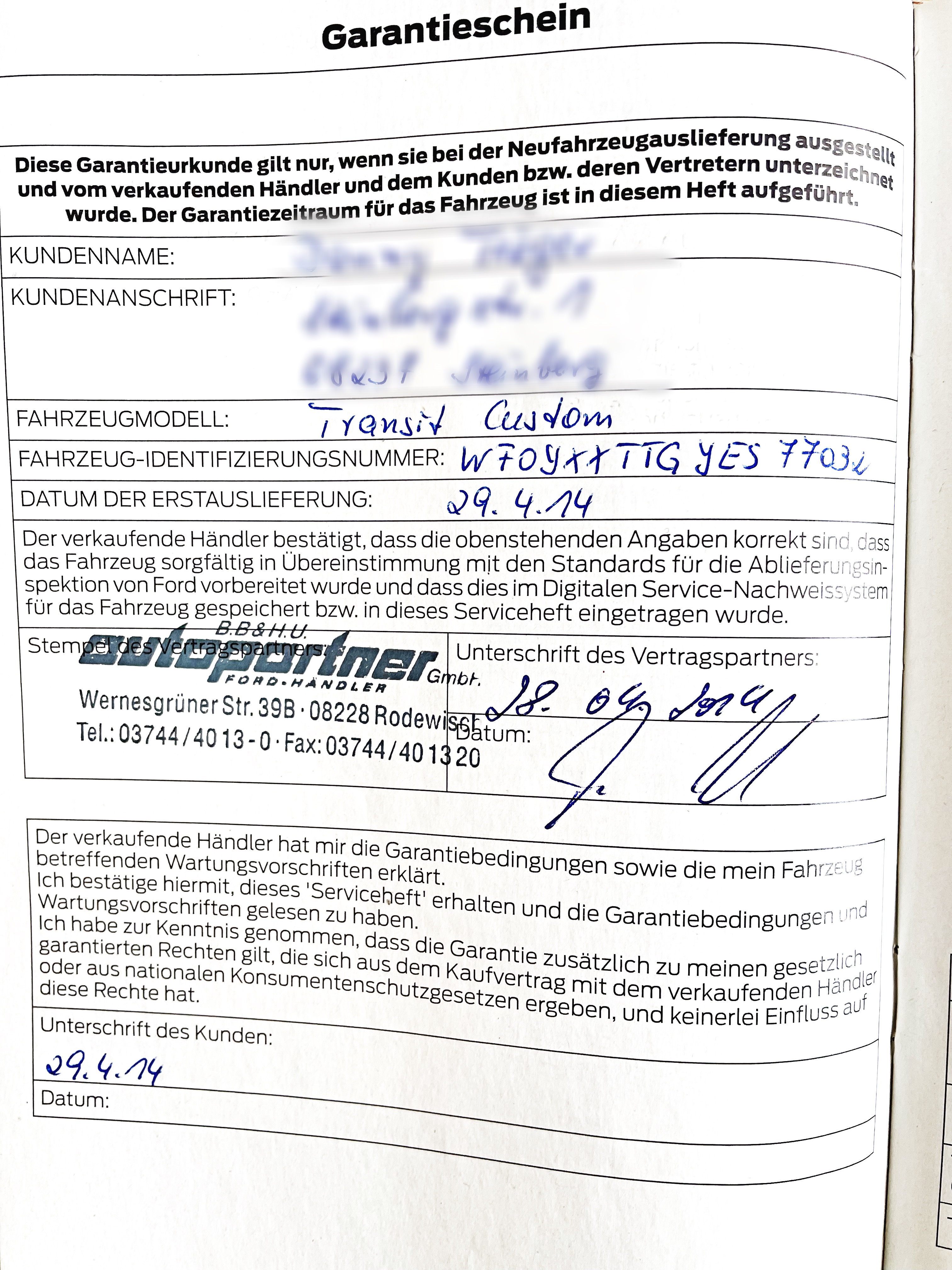 Vozidlo zakoupeno jako nové u autorizovaného dealera Ford B.B&H.U. AUTOPARTNER FORD HANDLER GMBH Rodewisch v Německu, jako ojeté u autorizovaného dealer Ford Autohaus Pfüller e.K. Thalheim v Německu.