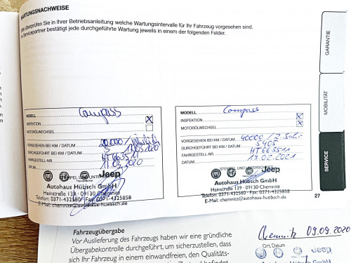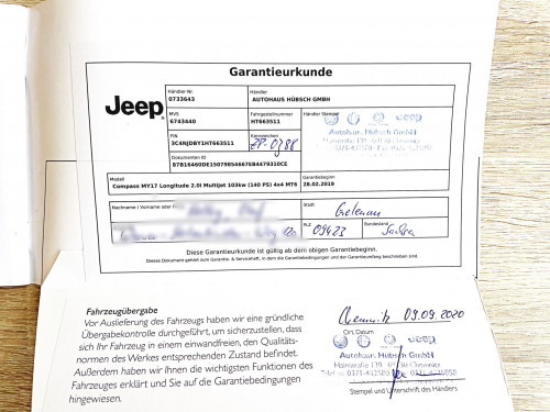 Vozidlo zakoupeno jako nové i ojeté u autorizovaného dealera Jeep Autohaus HÜBCHS GMBH v Chemnitzu v Německu. Velmi málo používané vozidlo.