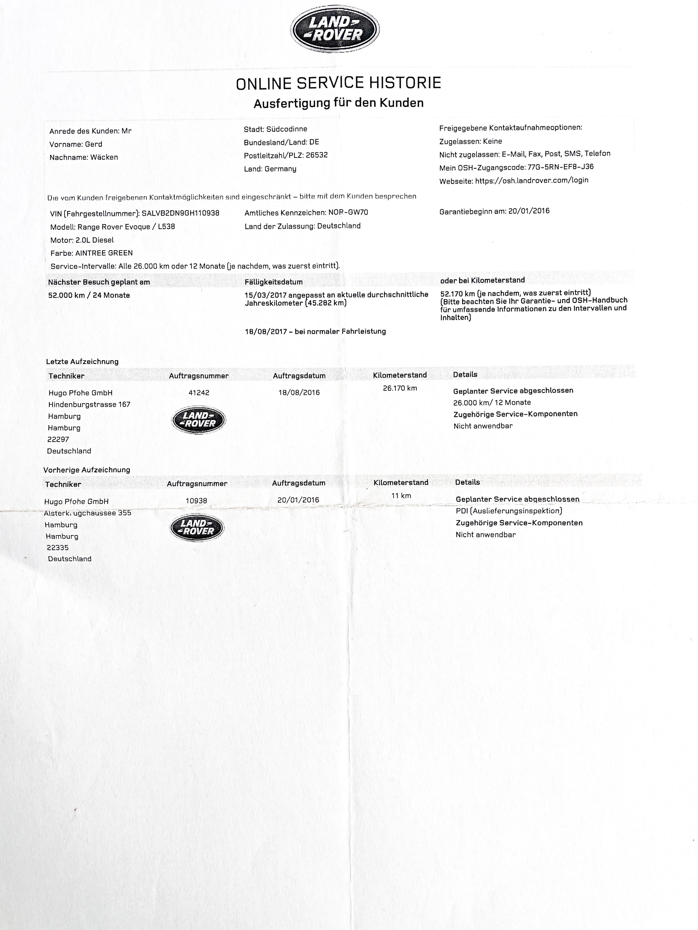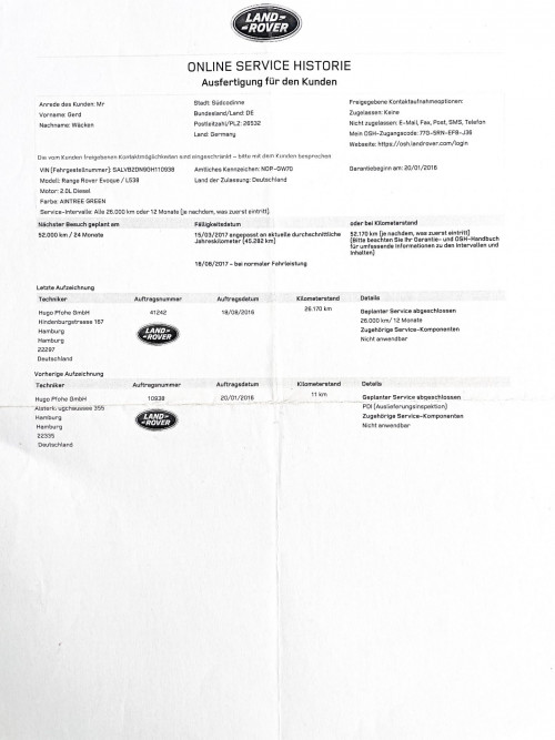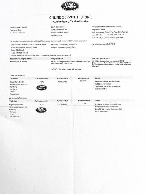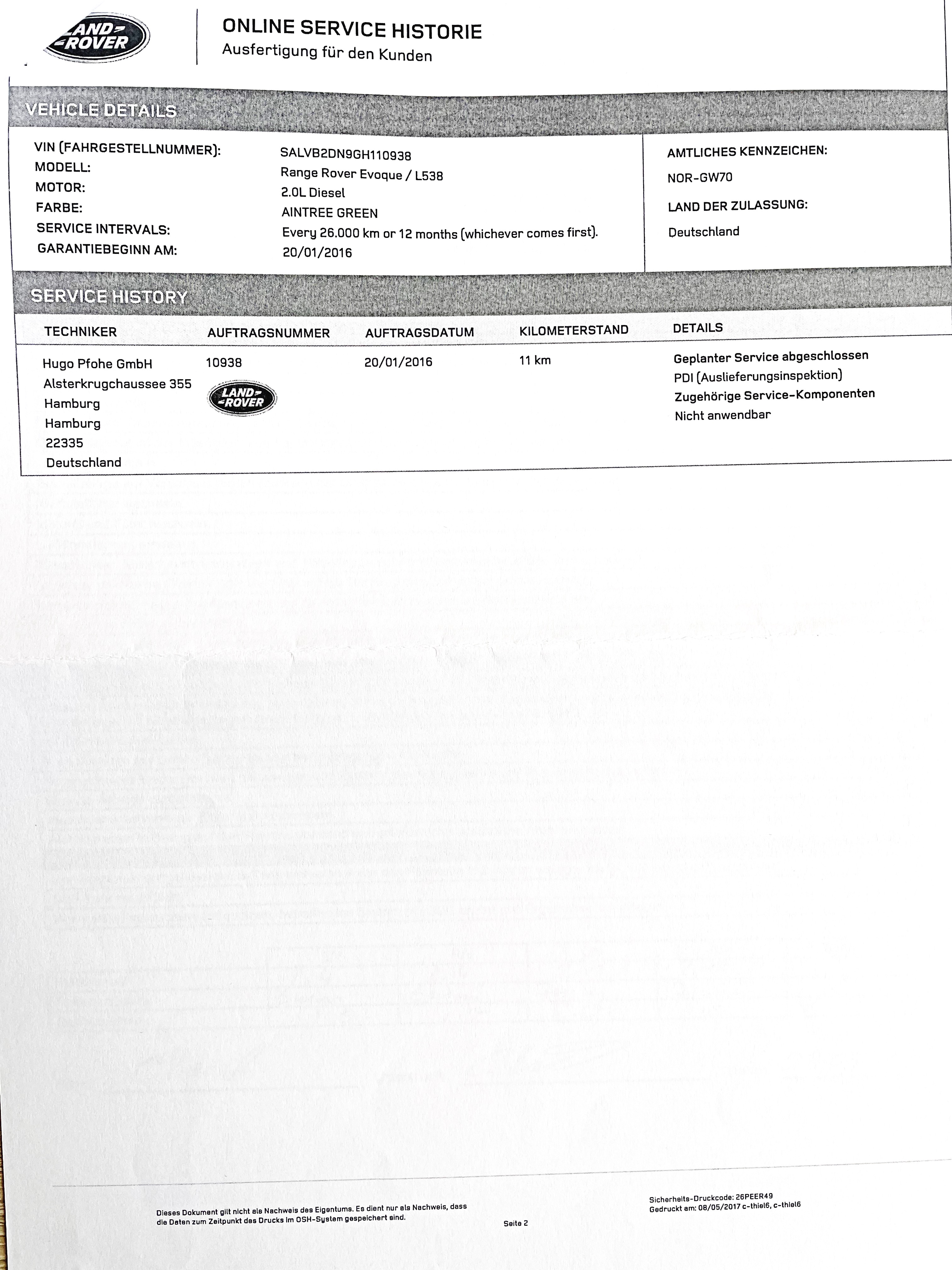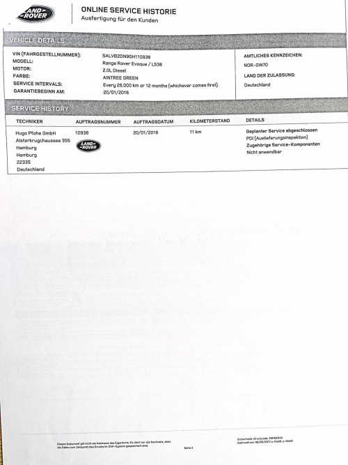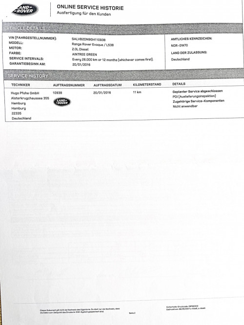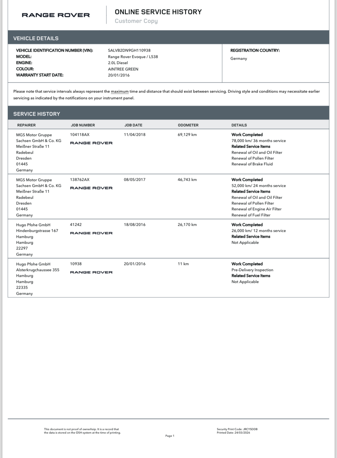 Vozidlo zakoupeno jako nové u autorizovaného dealera Land Rover/Range Rover Hugo Pfohe GMBH v Hamburku v Německu, jako ojeté u autorizovaného dealera Automobile Lorenz OHG v Olbernhau v Německu. Po celou dobu pravidelná údržba dle předpisu výrobce Land Rover/Range Rover a to do roku 2025 u autorizovaných dealerů výše uvedených.