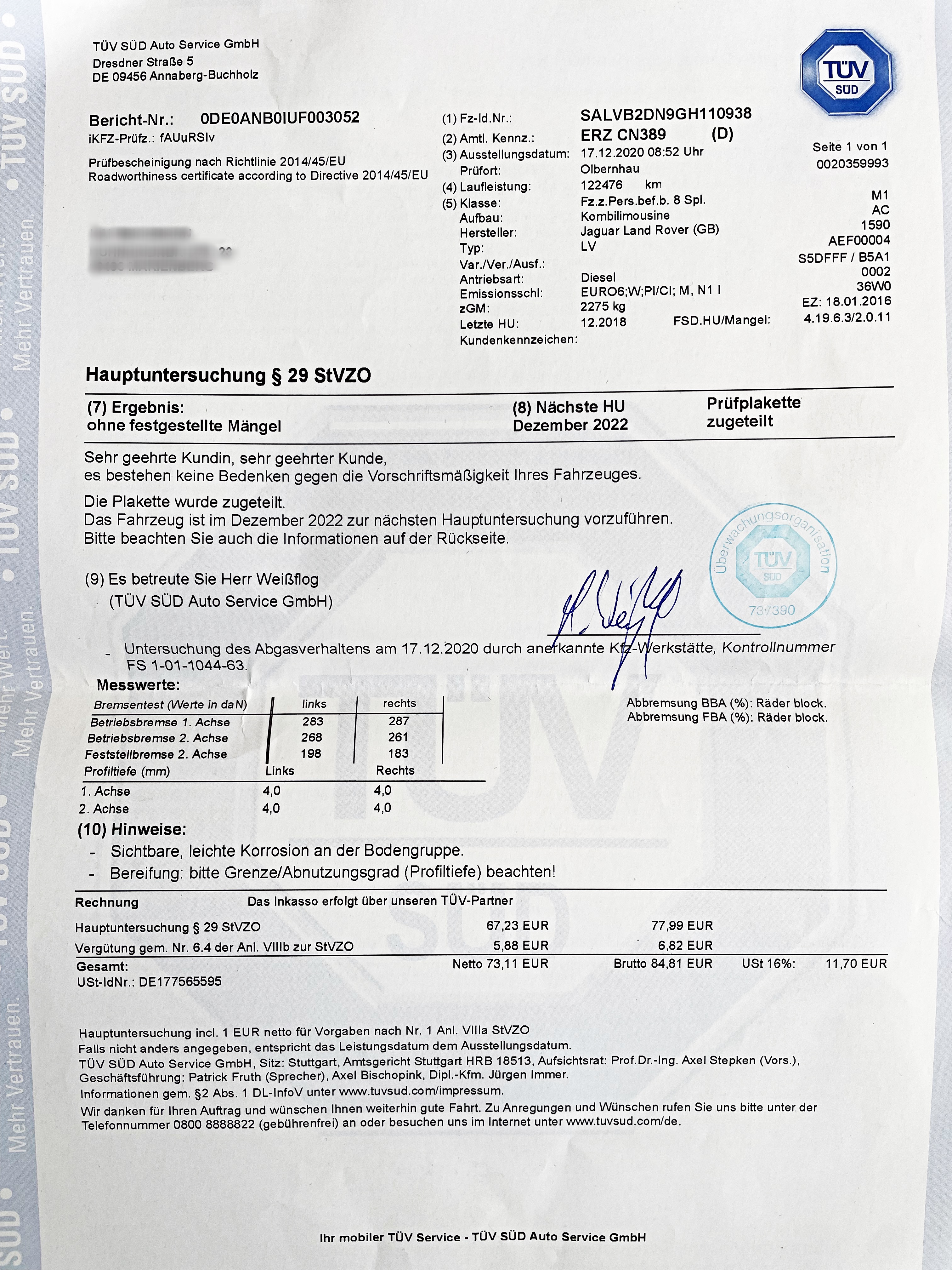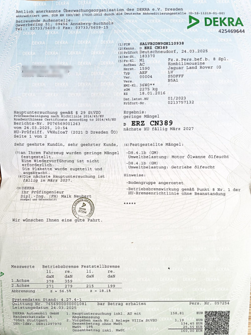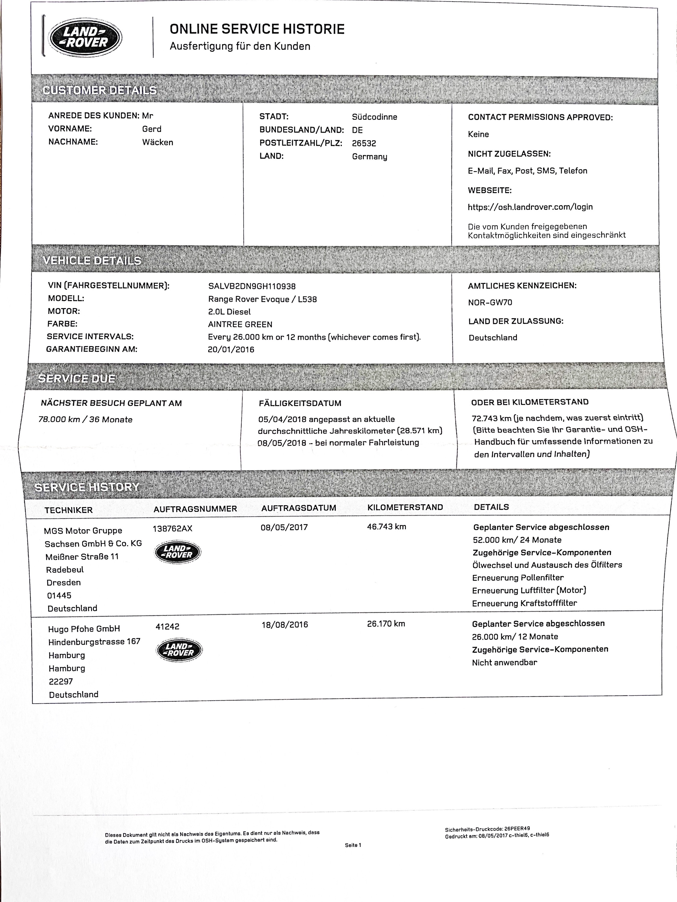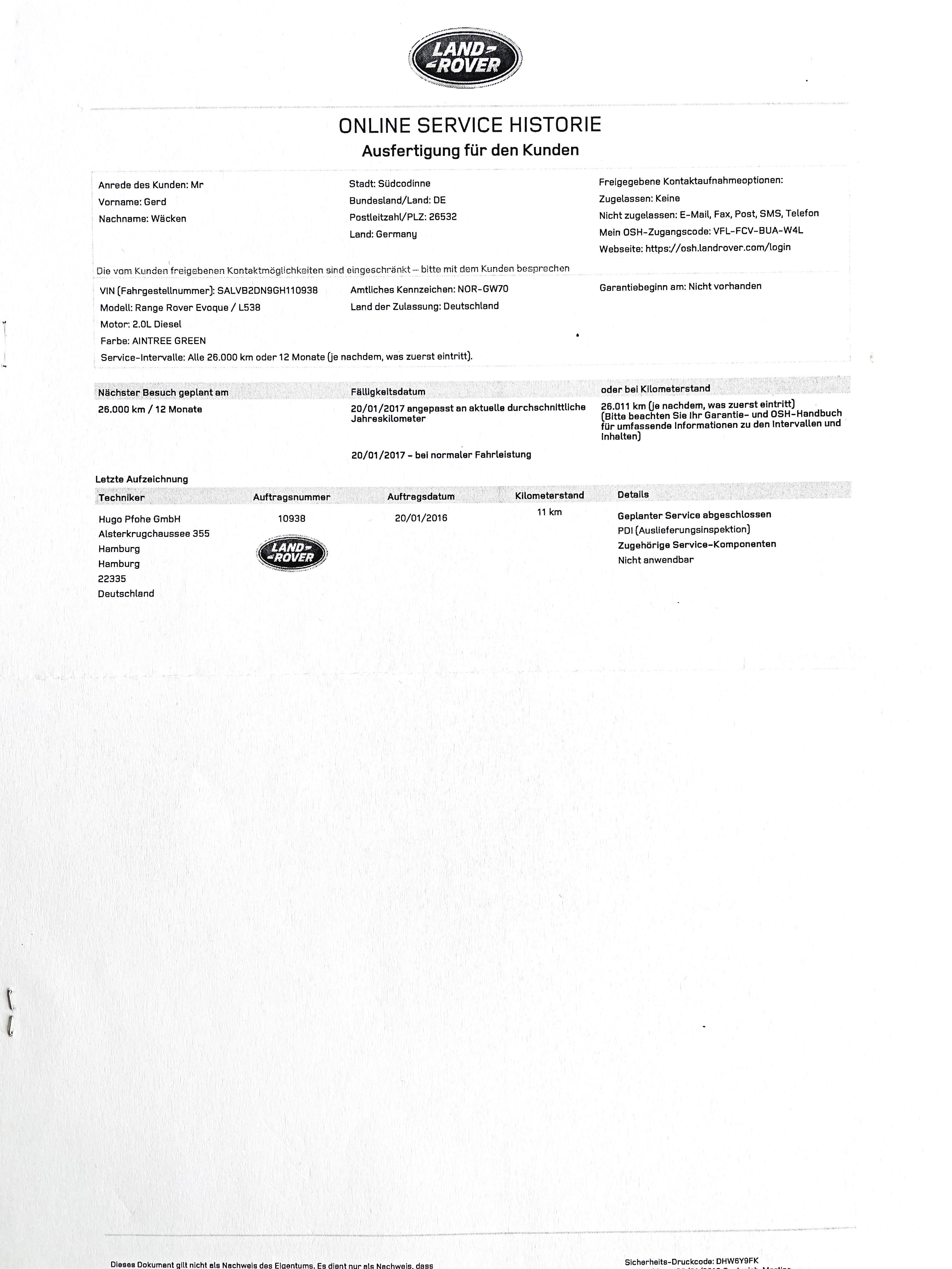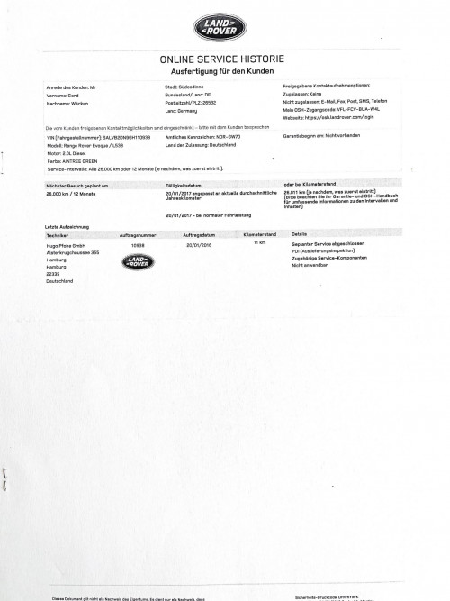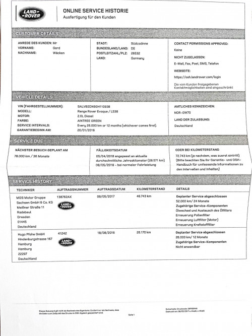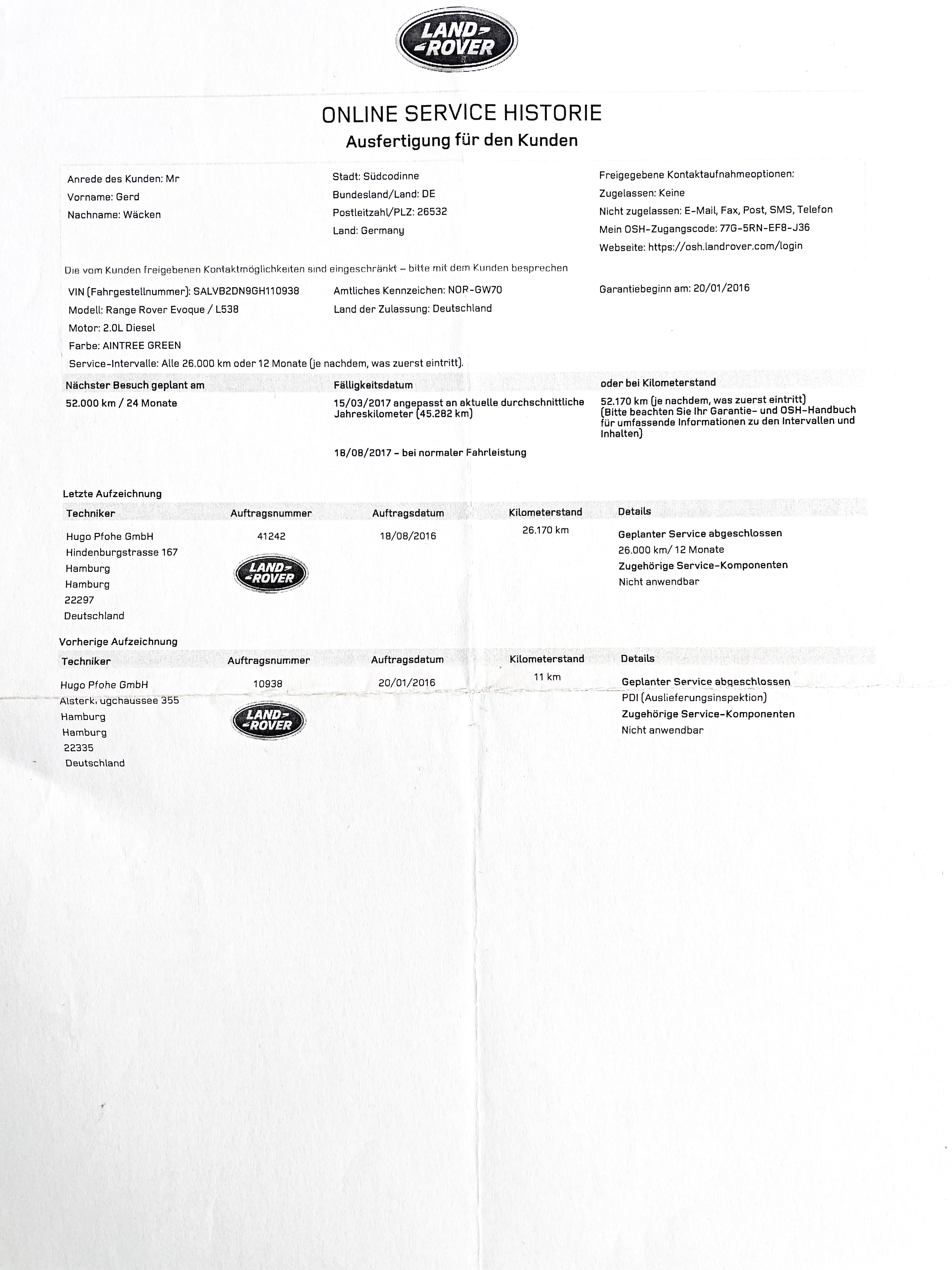 Vozidlo zakoupeno jako nové u autorizovaného dealera Land Rover/Range Rover Hugo Pfohe GMBH v Hamburku v Německu, jako ojeté u autorizovaného dealera Automobile Lorenz OHG v Olbernhau v Německu. Po celou dobu pravidelná údržba dle předpisu výrobce Land Rover/Range Rover a to do roku 2025 u autorizovaných dealerů výše uvedených.