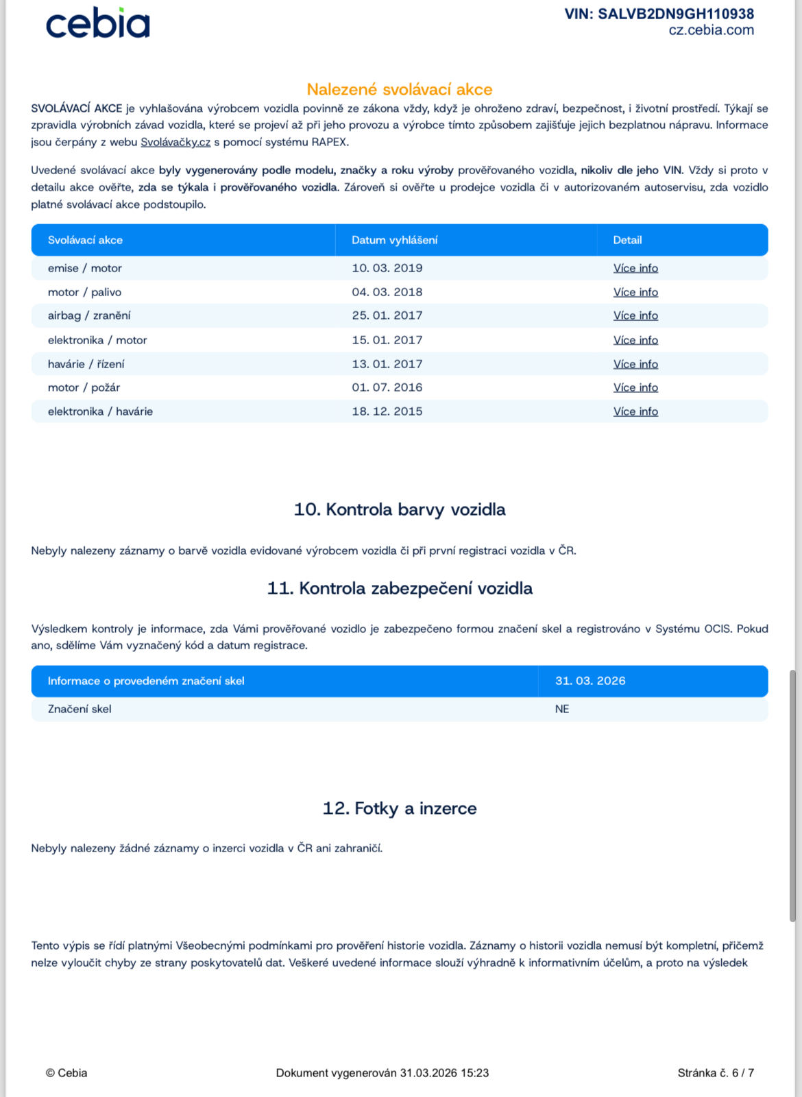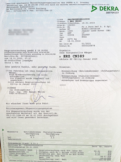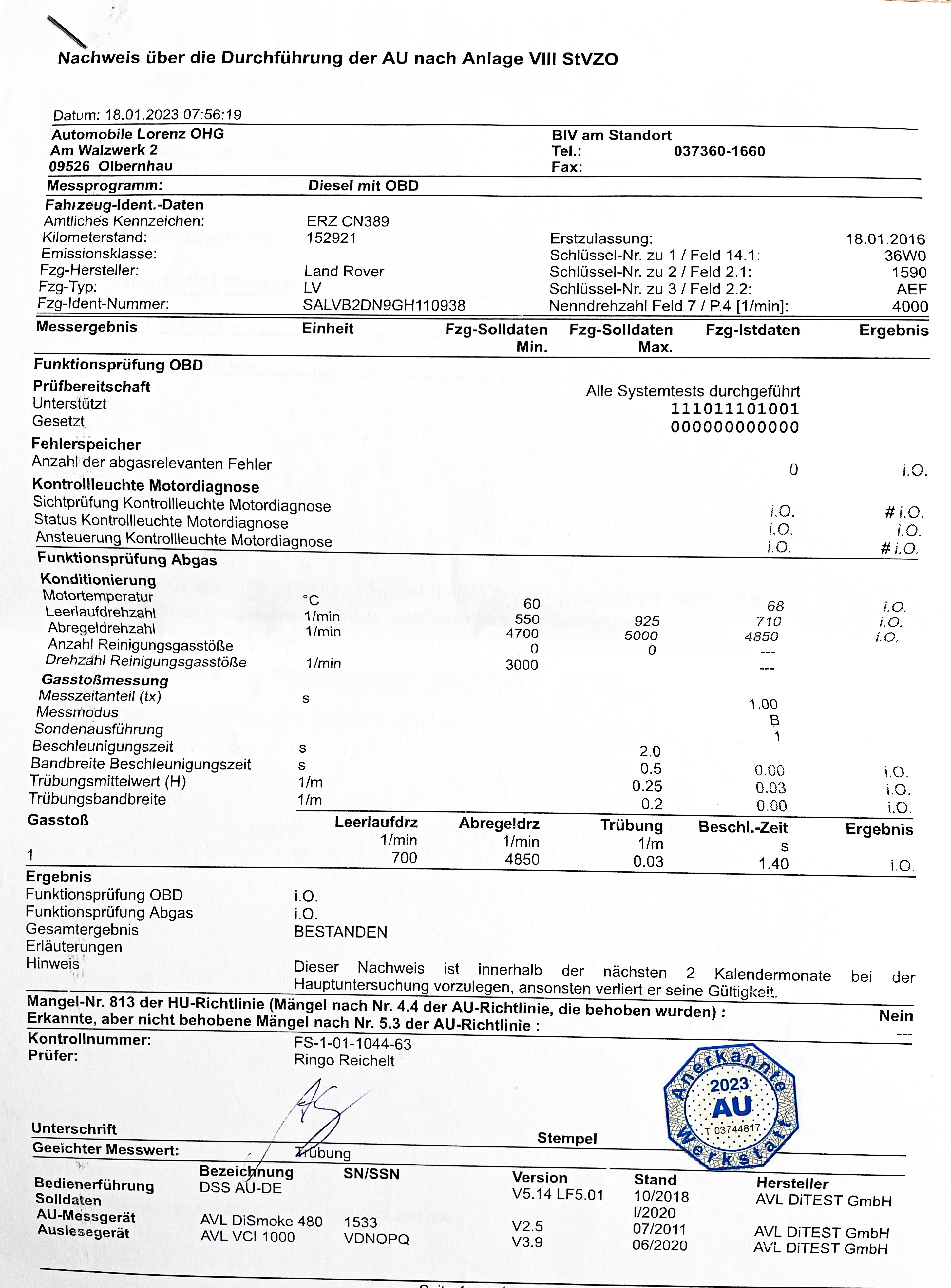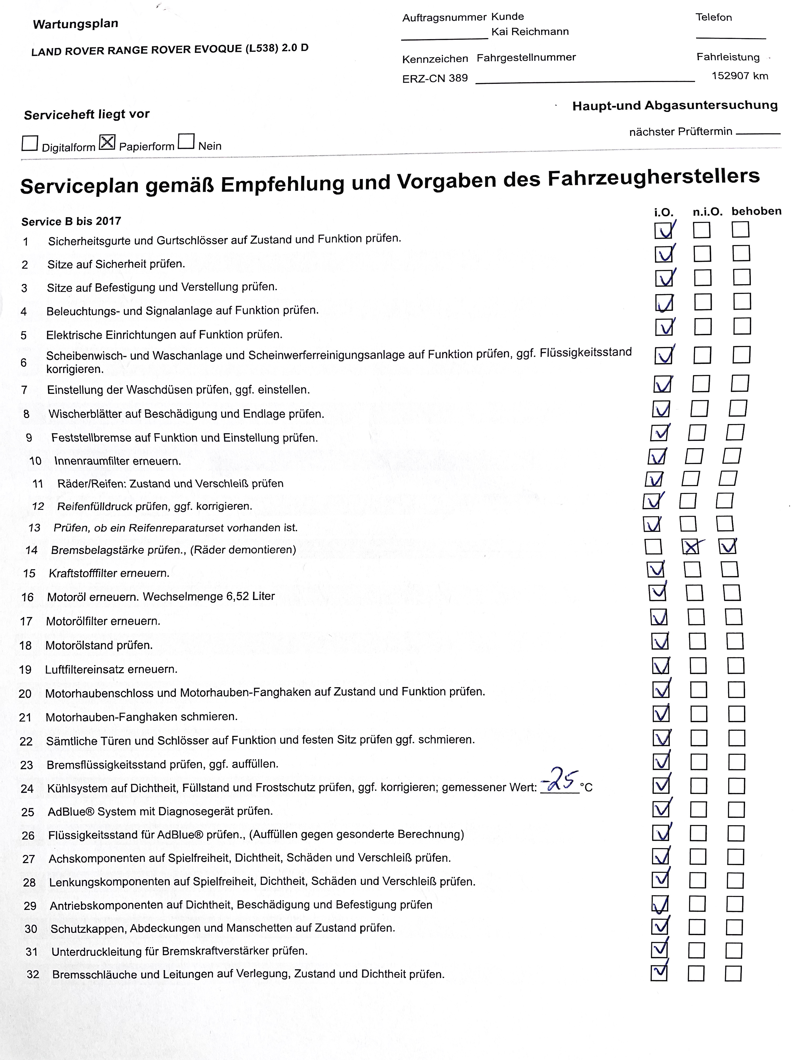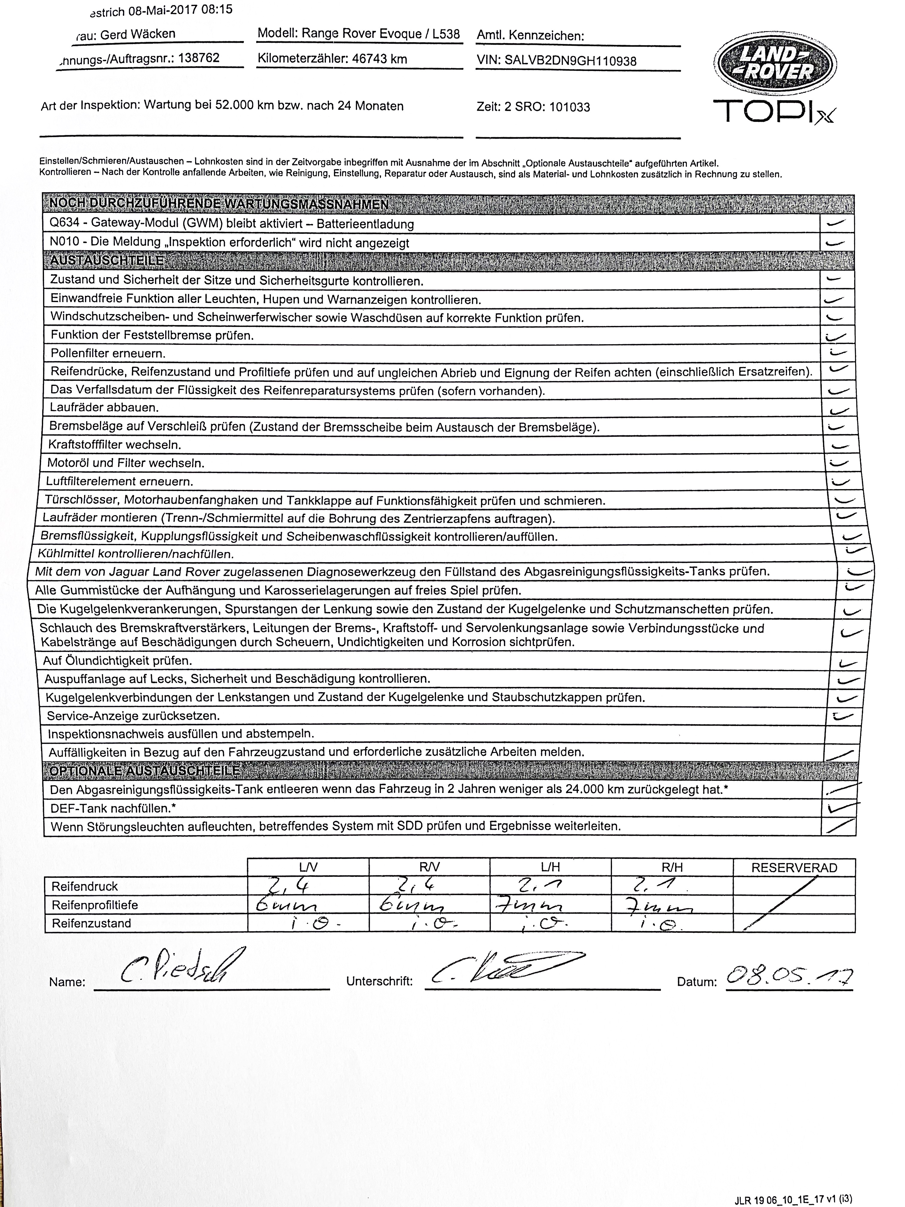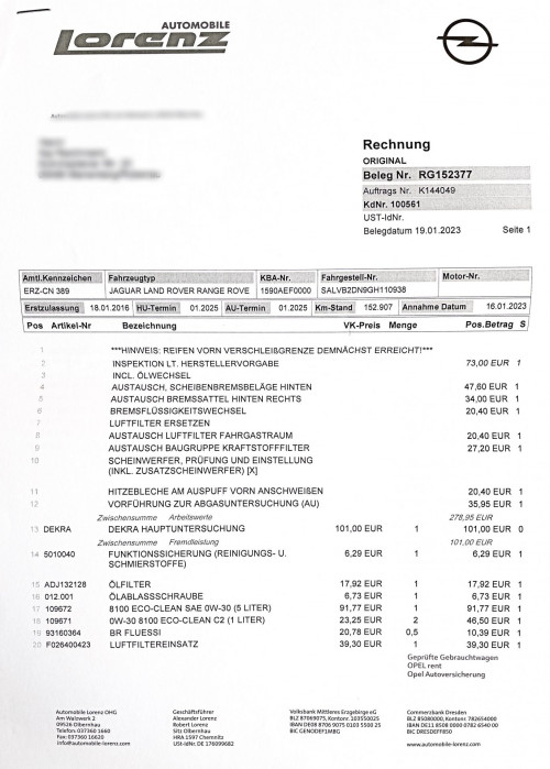 Vozidlo zakoupeno jako nové u autorizovaného dealera Land Rover/Range Rover Hugo Pfohe GMBH v Hamburku v Německu, jako ojeté u autorizovaného dealera Automobile Lorenz OHG v Olbernhau v Německu. Po celou dobu pravidelná údržba dle předpisu výrobce Land Rover/Range Rover a to do roku 2025 u autorizovaných dealerů výše uvedených.