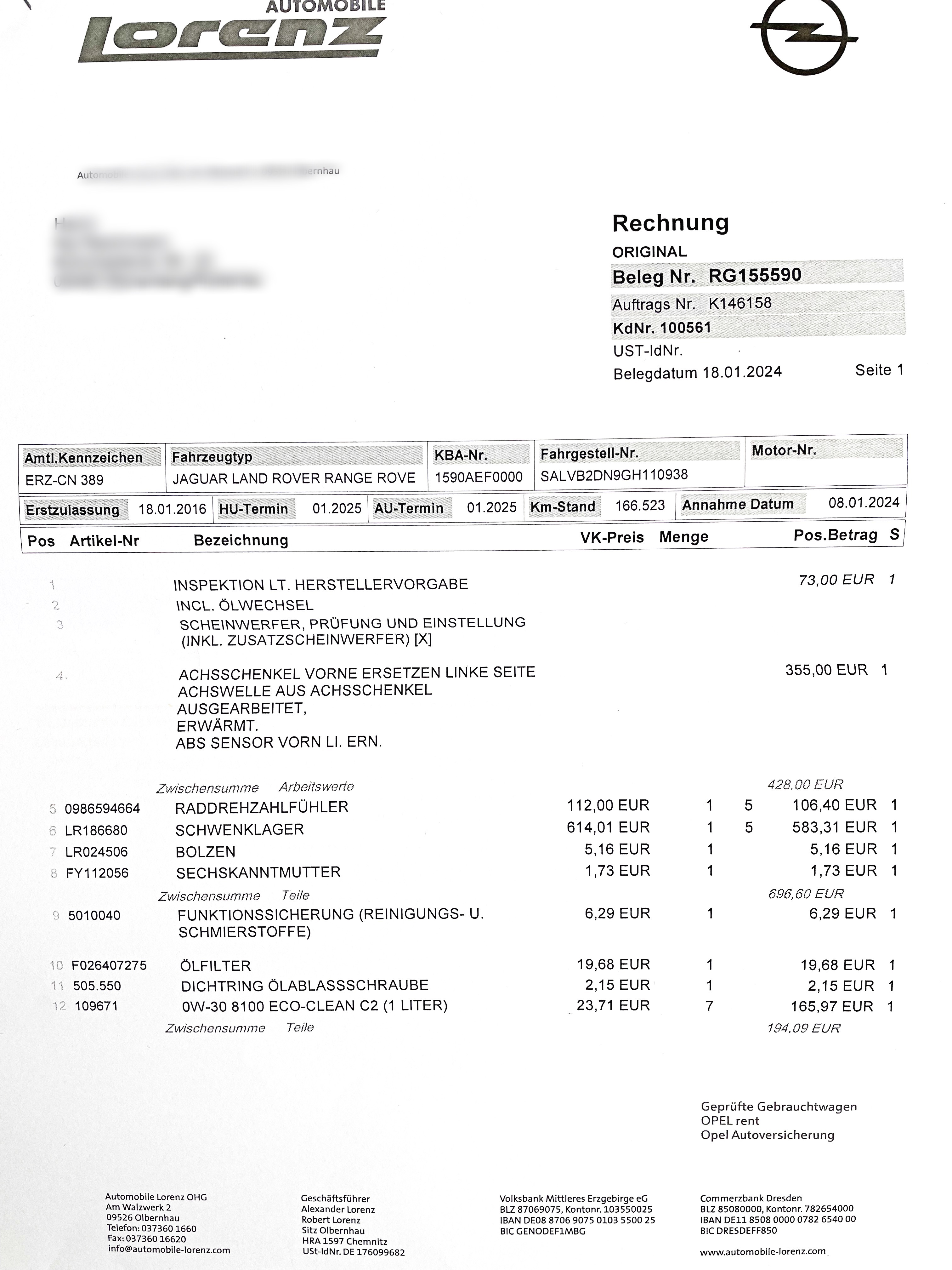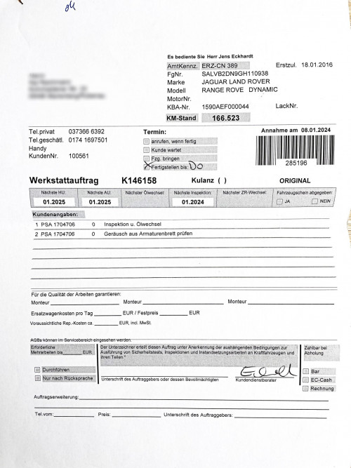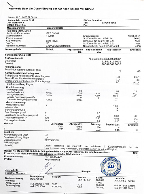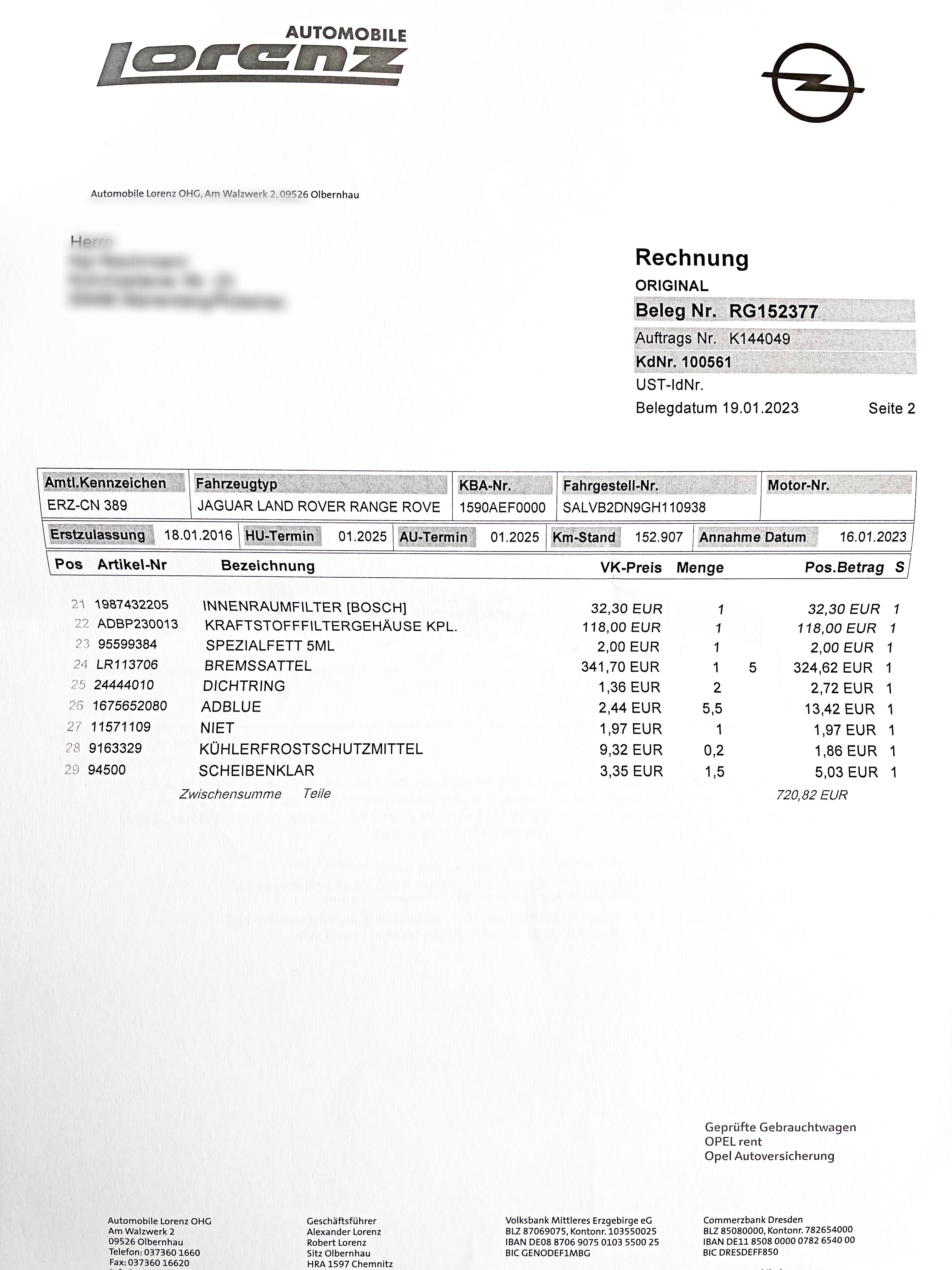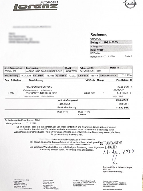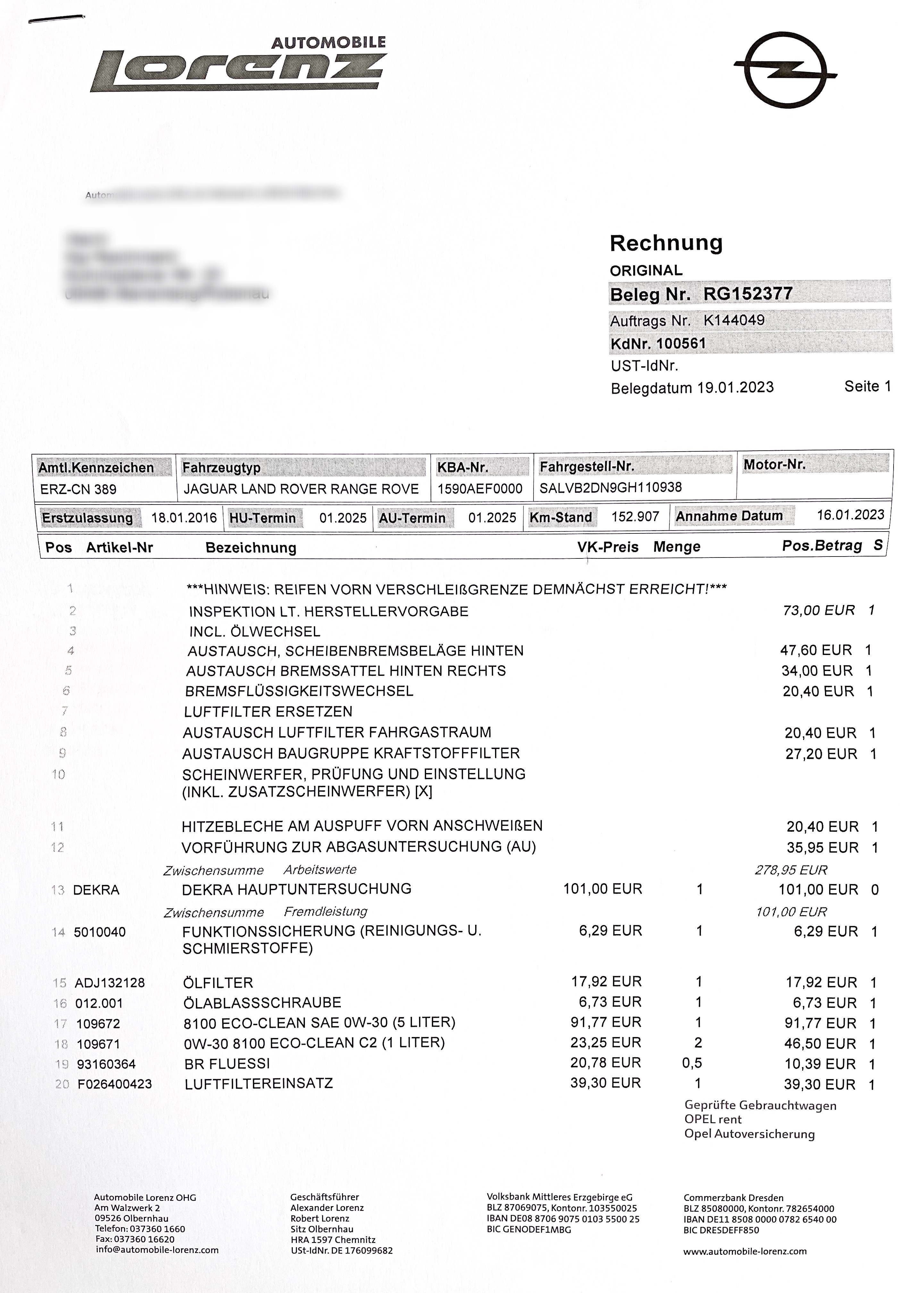 Vozidlo zakoupeno jako nové u autorizovaného dealera Land Rover/Range Rover Hugo Pfohe GMBH v Hamburku v Německu, jako ojeté u autorizovaného dealera Automobile Lorenz OHG v Olbernhau v Německu. Po celou dobu pravidelná údržba dle předpisu výrobce Land Rover/Range Rover a to do roku 2025 u autorizovaných dealerů výše uvedených.