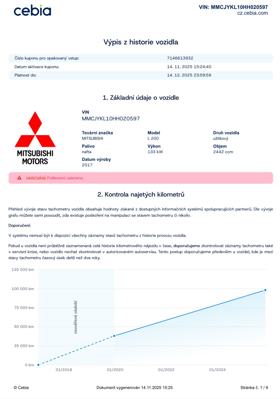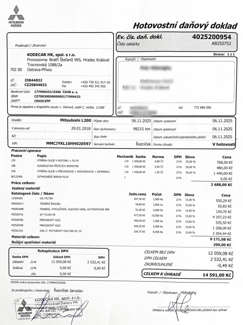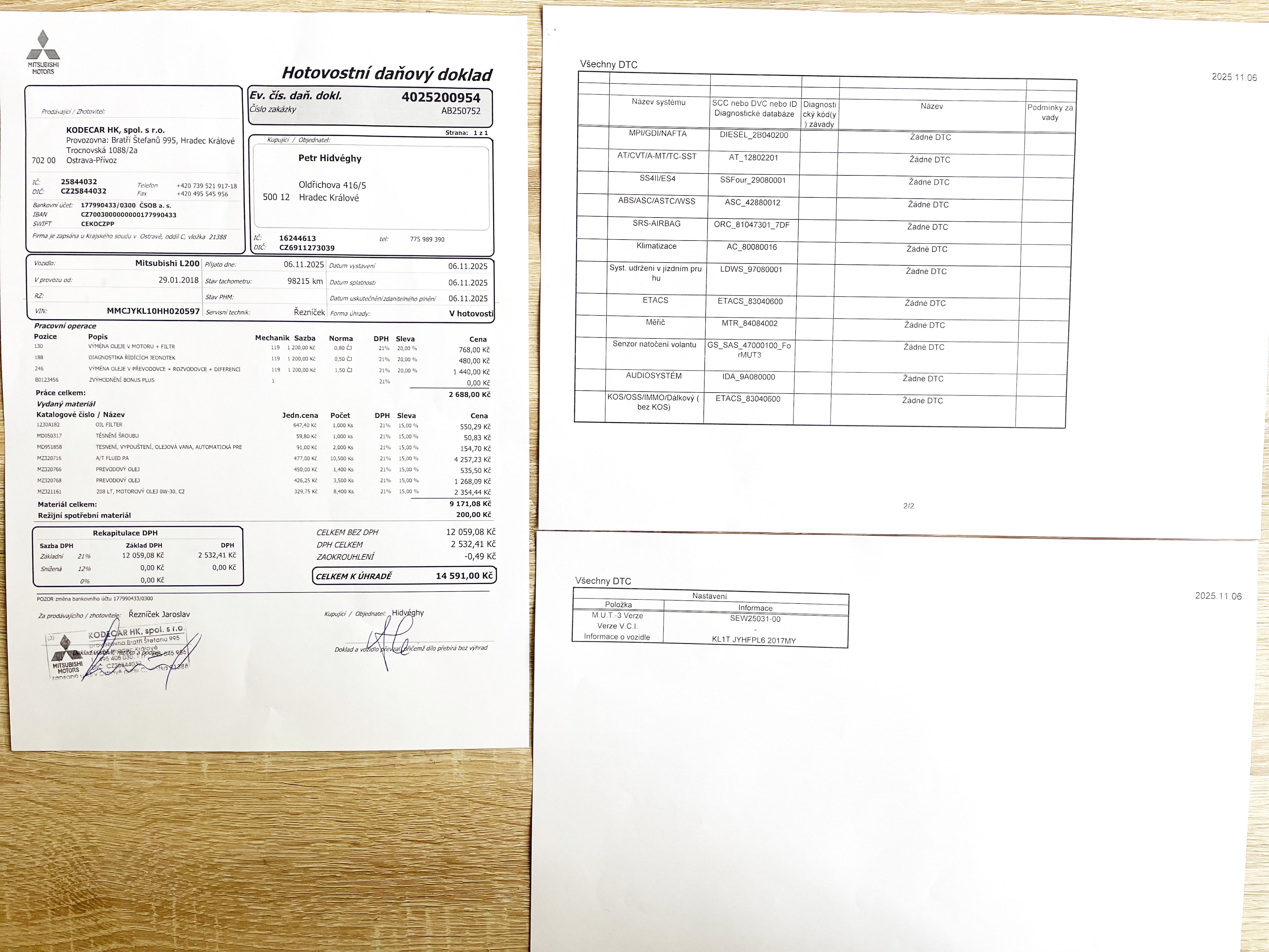 NYNÍ PO KOMPLETNÍ PŘEDPRODEJNÍ KONTROLE A VĚTŠÍM SERVISU VOZIDLA U AUTORIZOVANÉHO DEALERA MITSUBISHI KODE CAR V HRADCI KRÁLOVÉ DNE 6.11.2025 NA 98.215KM - KOMPLETNÍ PŘEDPRODEJNÍ PROHLÍDKA PODVOZKU,NÁPRAV,ŘÍZENÍ, TUHOSTI A TO VČETNĚ KOMPLETNÍ DIAGNOSTIKY VOZIDLA+NOVÝ OLEJ V MOTORU+OLEJOVÝ FILTR+NOVÝ OLEJ V PŘEVODOVCE+TĚSNĚNÍ+NOVÝ OLEJ V ROZVODOVCE A OBOU DIFERENCIÁLECH - NA VŠE FAKTURA Z AUTORIZOVANÉHO SERVISU A GARANTOVÁNO PŘI PRODEJI!