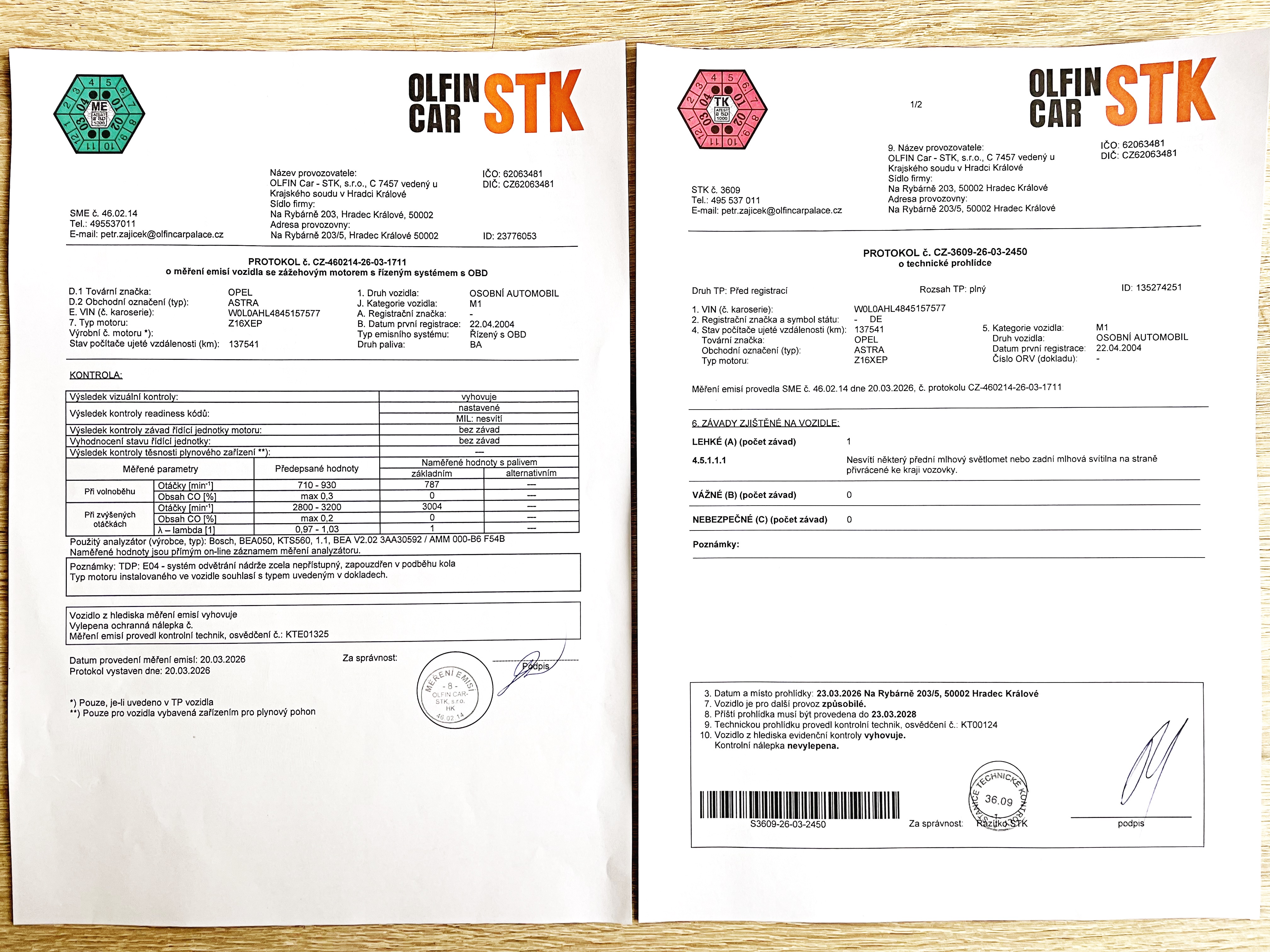 NOVÁ TECHNICKÁ KONTROLA A EMISE U OPEL STK OLFIN CAR V HK - PLATNÁ DO 3/2028 - PROŠLO BEZ VĚTŠÍCH PROBLÉMŮ.