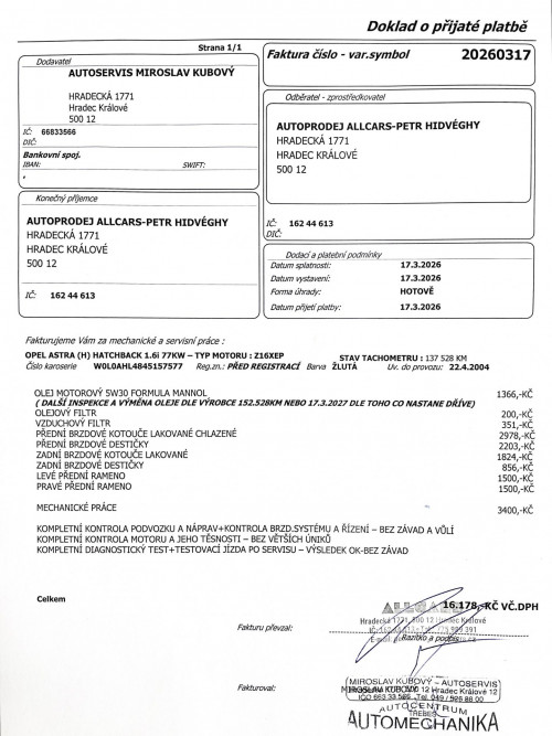 NYNÍ PO KOMPLETNÍ PŘEDPRODEJNÍ KONTROLE A SERVISU VOZIDLA 17.3.2026 NA 137.528KM V HODNOTĚ 16.178,- KČ - NOVÝ OLEJ V MOTORU+NOVÉ FILTRY(OLEJ,VZDUCH) + KOMPLETNÍ VÝMĚNA PŘEDNÍCH I ZADNÍCH BRZDOVÝCH KOTOUČŮ A DESTIČEK + NOVÉ SNÍMAČE OPOTŘEBENÍ + ÚPLNĚ NOVÁ PŘEDNÍ RAMENA ( LEVÉ I PRAVÉ) + NOVÁ BRZDOVÁ KAPALINA + KOMPLETNÍ KONTROLA PODVOZKU, NÁPRAV A ŘÍZENÍ + KONTROLA MOTORU A TĚSNOSTI + KOMPLETNÍ DIAGNOSTIKA VOZIDLA - VŠE ŘÁDNĚ DOLOŽENO FAKTUROU A GARANCE PROVEDENÝCH ÚKONŮ DO KUPNÍ SMLOUVY PŘI PRODEJI.