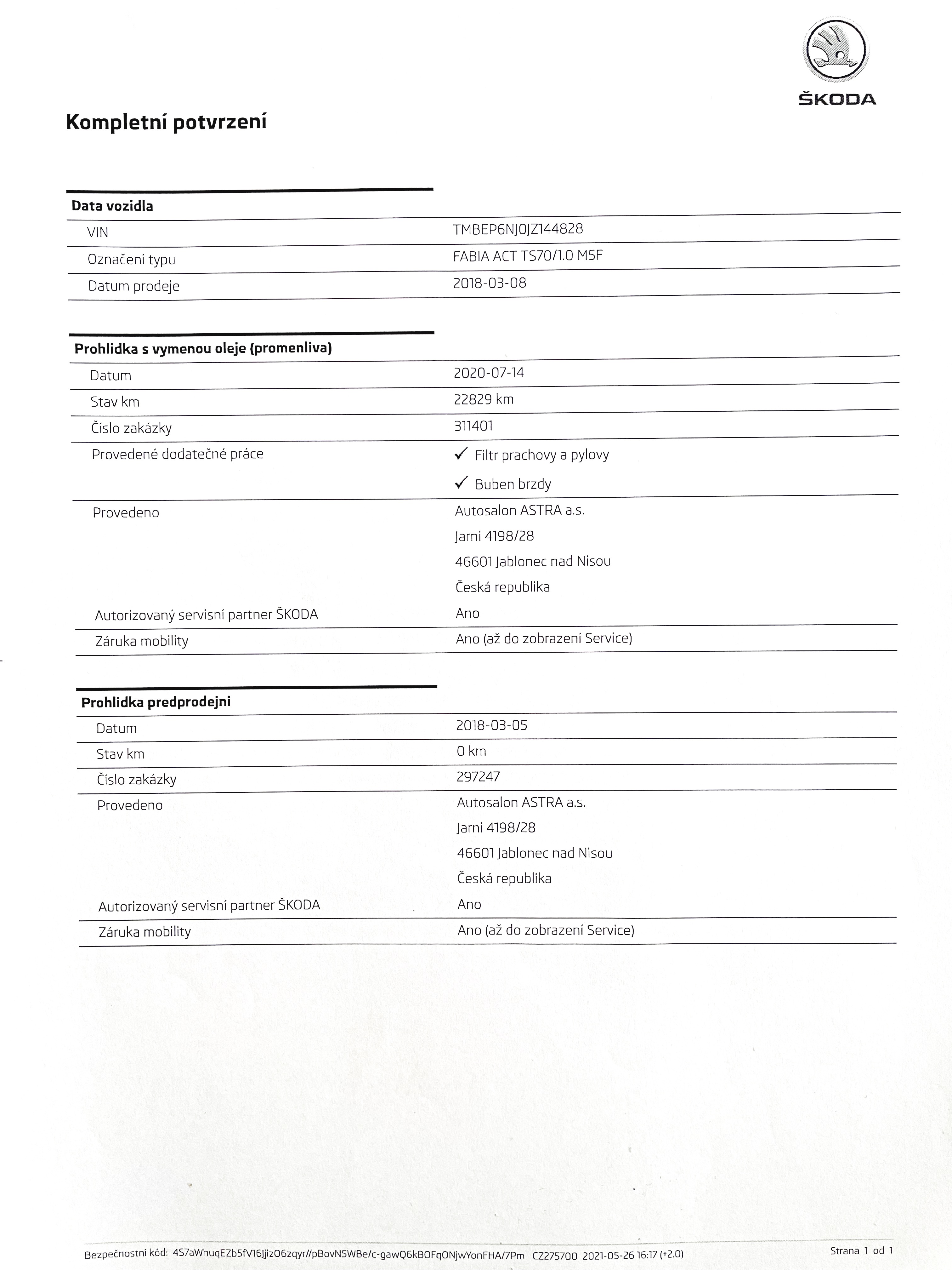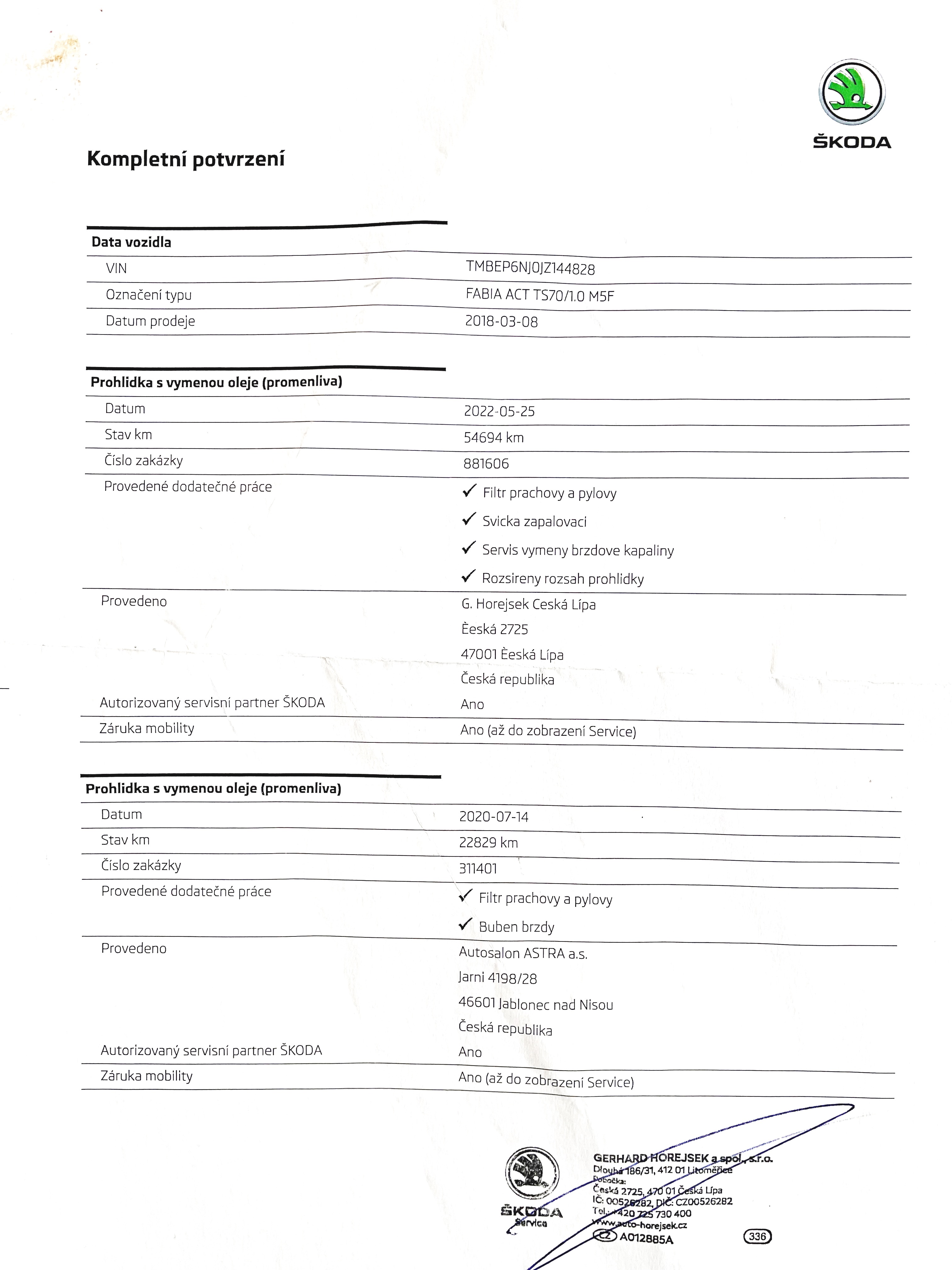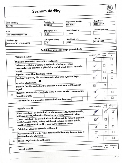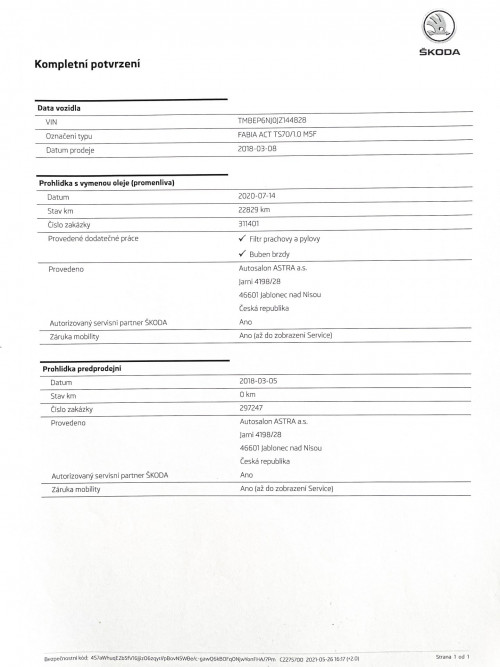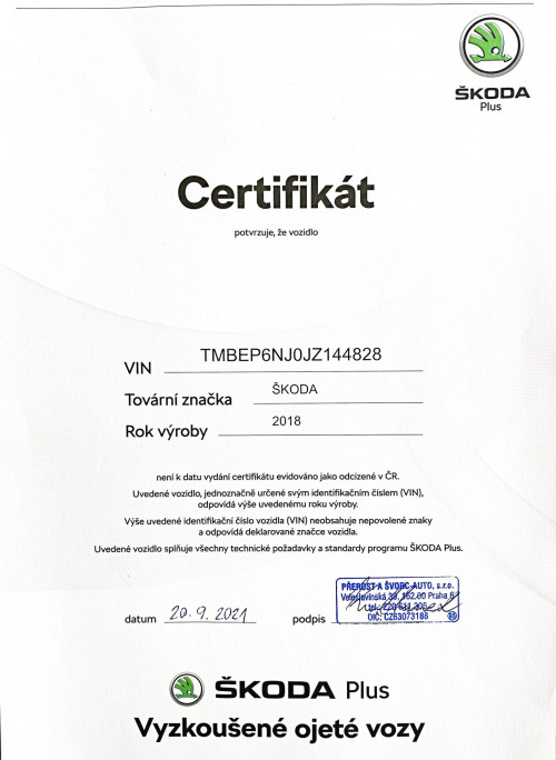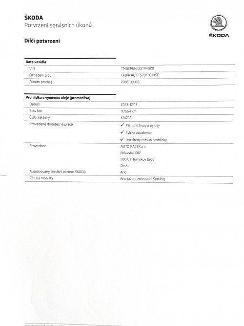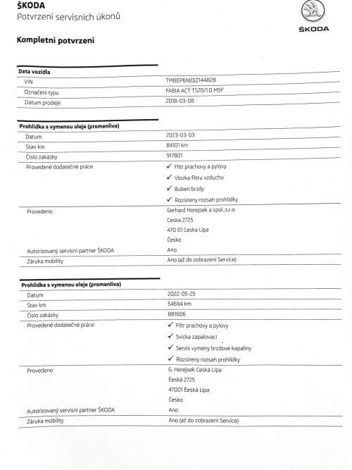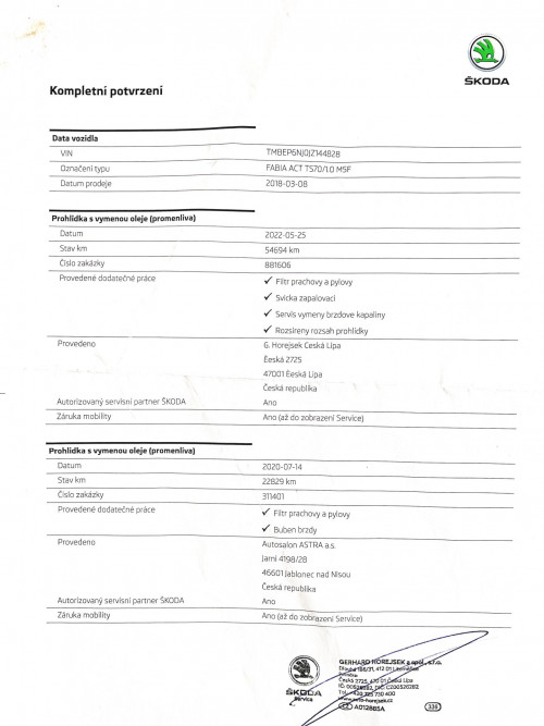 Vozidlo zakoupeno jako nové u autorizovaného dealera Škoda Autosalon Astra a.s. v Jablonci nad Nisou, jako ojeté u autorizovaného dealera Škoda Přerost&Švorc Auto s.r.o. Po celou dobu pravidelná údržba dle předepsaných intervalů údržby výrobce Škoda a to do roku 2024 pouze v autorizovaných servisech Škoda, jasně doloženo vytištěnou digitální historií a fakturami.
