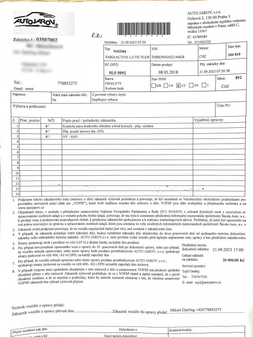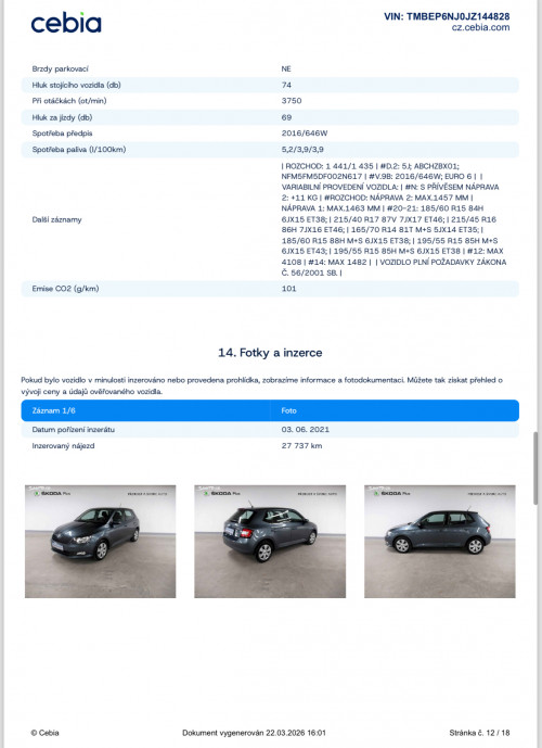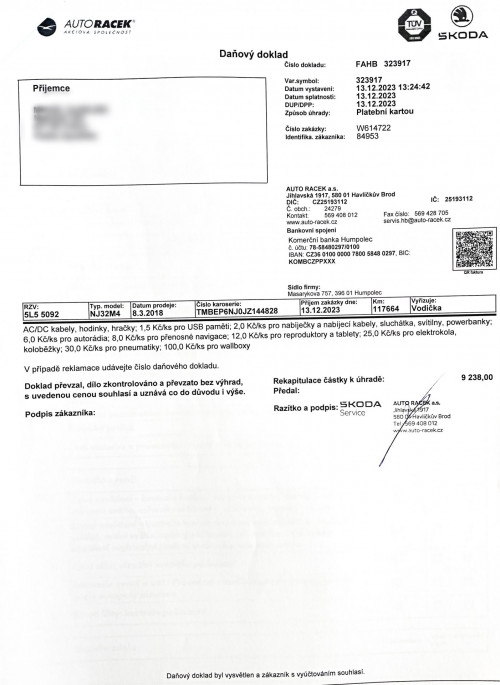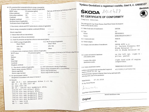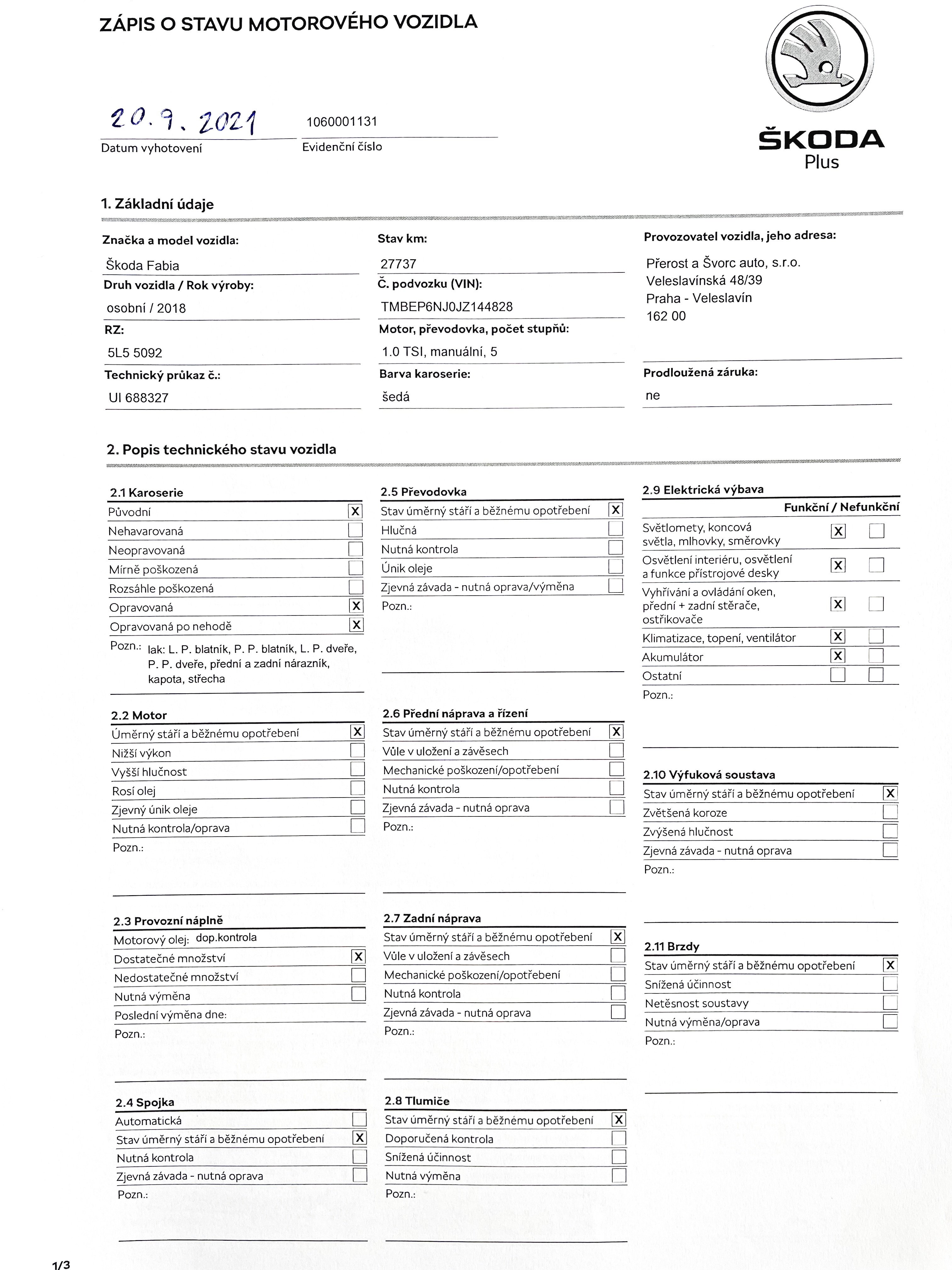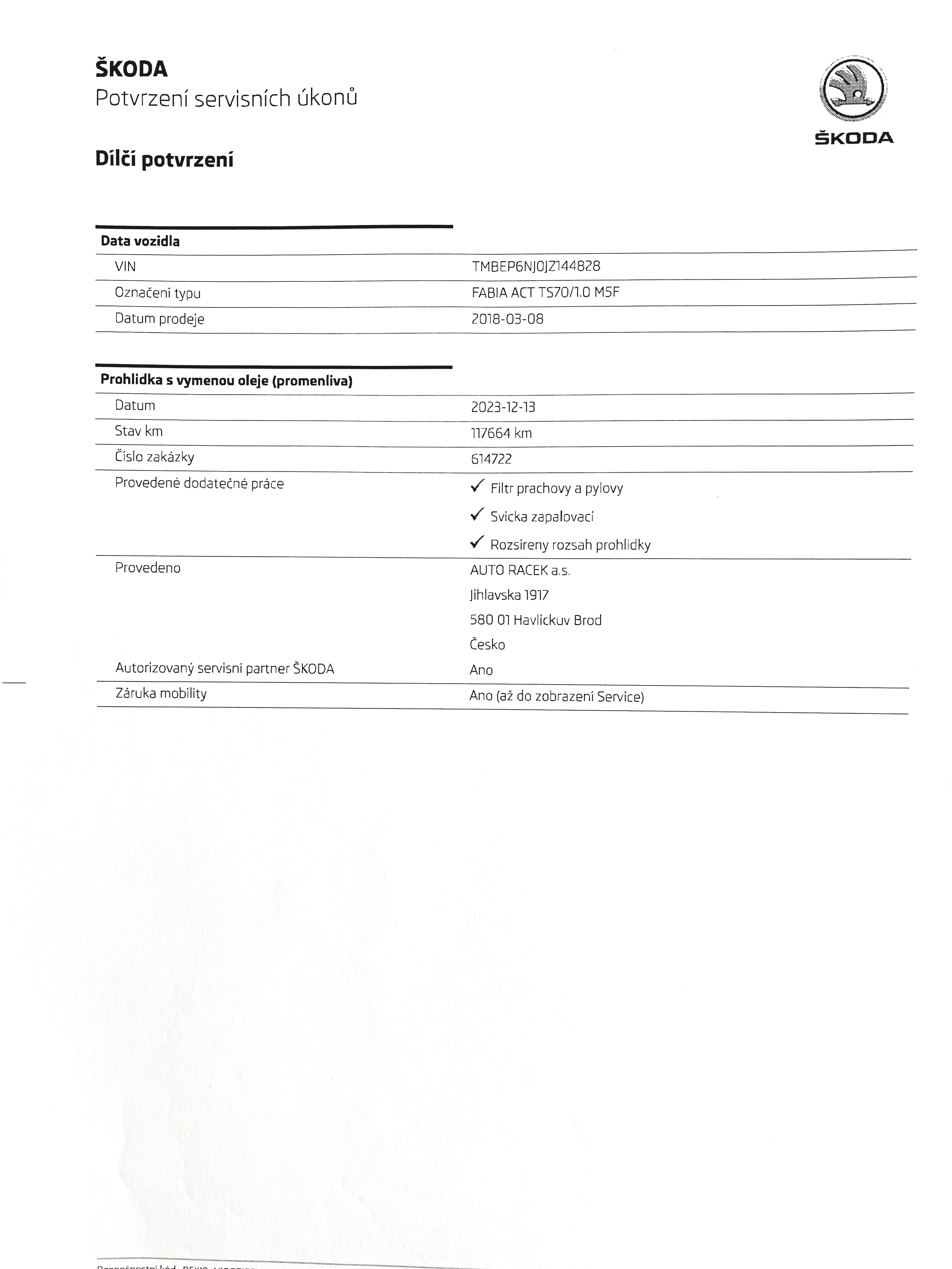 Vozidlo zakoupeno jako nové u autorizovaného dealera Škoda Autosalon Astra a.s. v Jablonci nad Nisou, jako ojeté u autorizovaného dealera Škoda Přerost&Švorc Auto s.r.o. Po celou dobu pravidelná údržba dle předepsaných intervalů údržby výrobce Škoda a to do roku 2024 pouze v autorizovaných servisech Škoda, jasně doloženo vytištěnou digitální historií a fakturami.