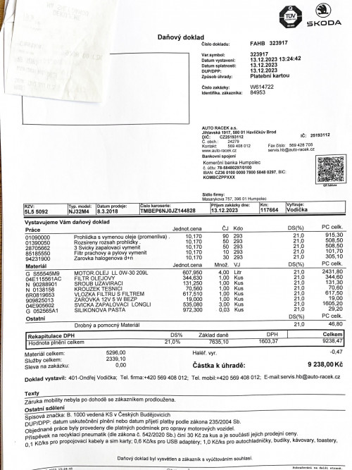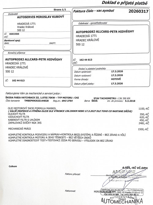 NYNÍ PO KOMPLETNÍ PŘEDPRODEJNÍ KONTROLE A SERVISU VOZIDLA V NAŠEM SERVISNÍM ZÁZEMÍ V HRADCI KRÁLOVÉ 13.3.2026 NA 136.390KM - NOVÝ OLEJ V MOTORU+NOVÉ FILTRY ( OLEJ, VZDUCH, KABINA S UHLÍKEM) + NOVÉ ZAPALOVACÍ SVÍČKY NGK + KOMPLETNÍ KONTROLA PODVOZKU, NÁPRAV, ŘÍZENÍ A VŮLÍ+KONTROLA STAVU BRZD+KOMPLETNÍ DIAGNOSTIKA VOZIDLA - FAKTURA A GARANCE PROVEDENÝCH ÚKONŮ PŘI PRODEJI.
