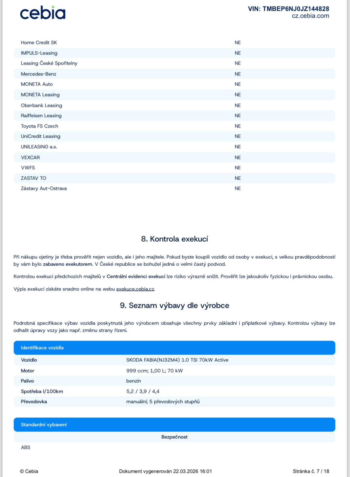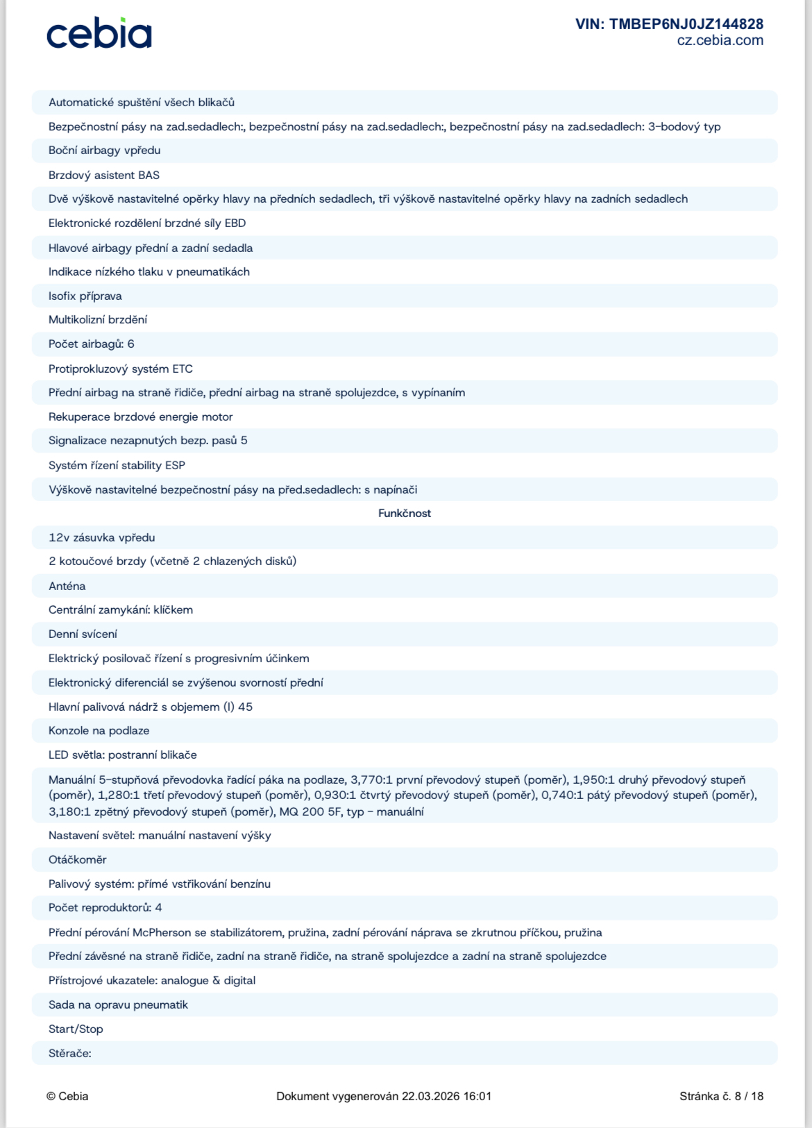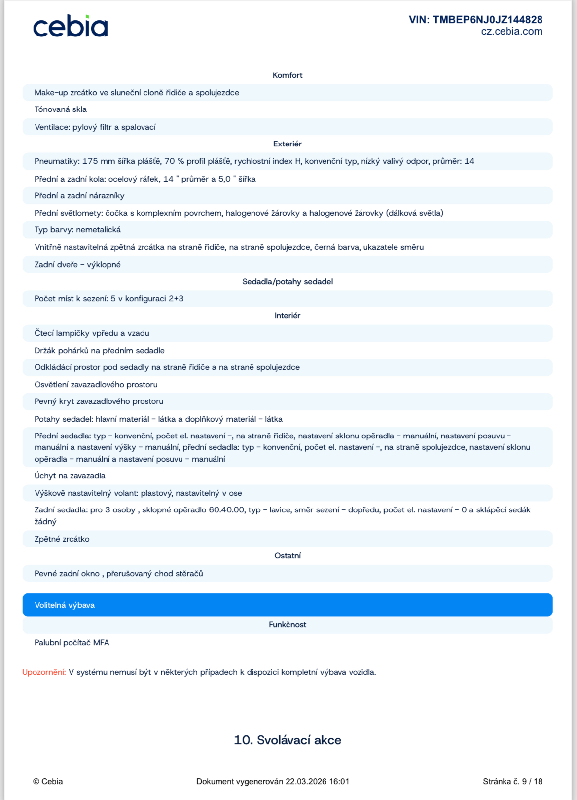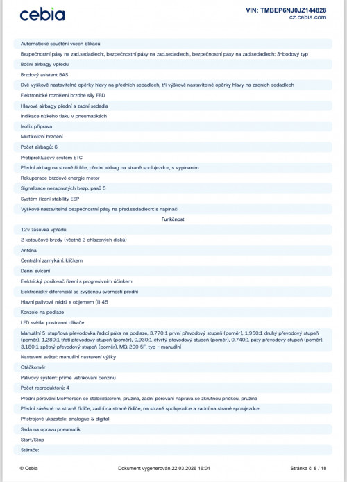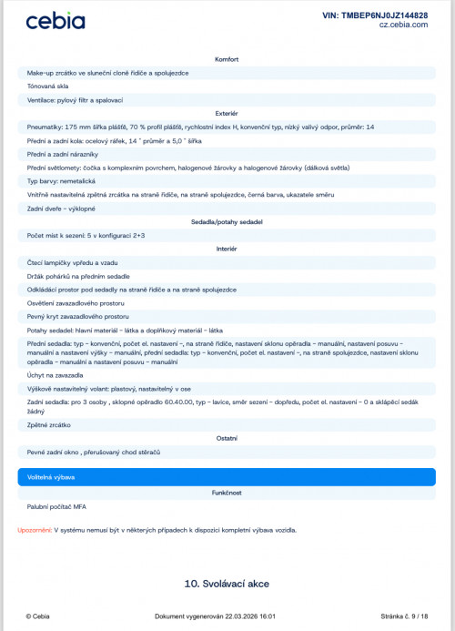 Platná STK, Servisní knížka, ABS, centrální zamykání, dálkové centrální zamykání, el. ovládání oken, ESP, isofix, palubní počítač, posilovač řízení, záruka, nastavitelné sedačky, nastavitelný volant, vyhřívané zadní okno, vypínatelný airbag spolujezdce, vyhřívaná zrcátka