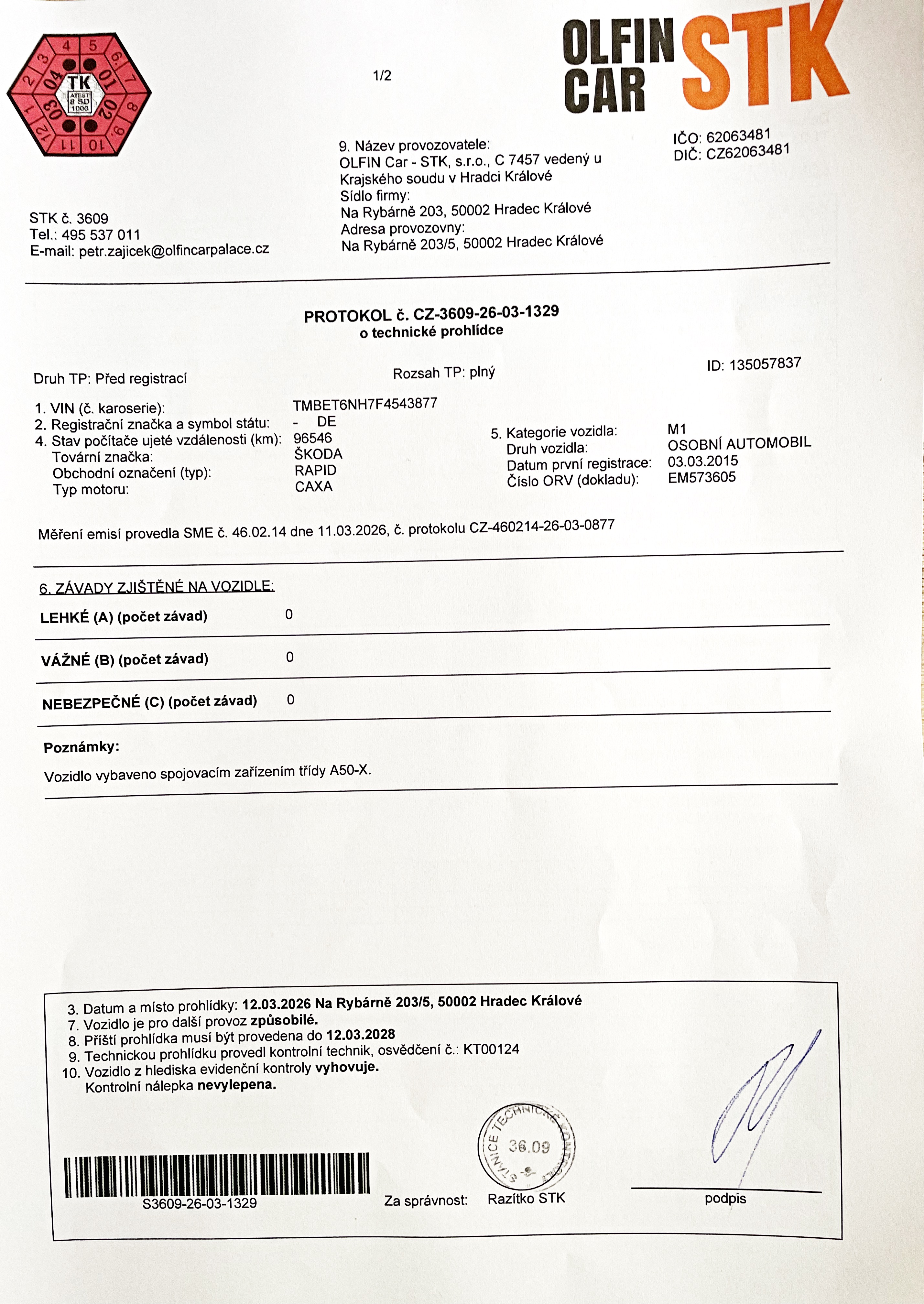 NOVÁ TECHNICKÁ KONTROLA A EMISE U STK OLFIN CAR HK DO 3/2028 - BEZ JEDINNÉ ZÁVADY!
