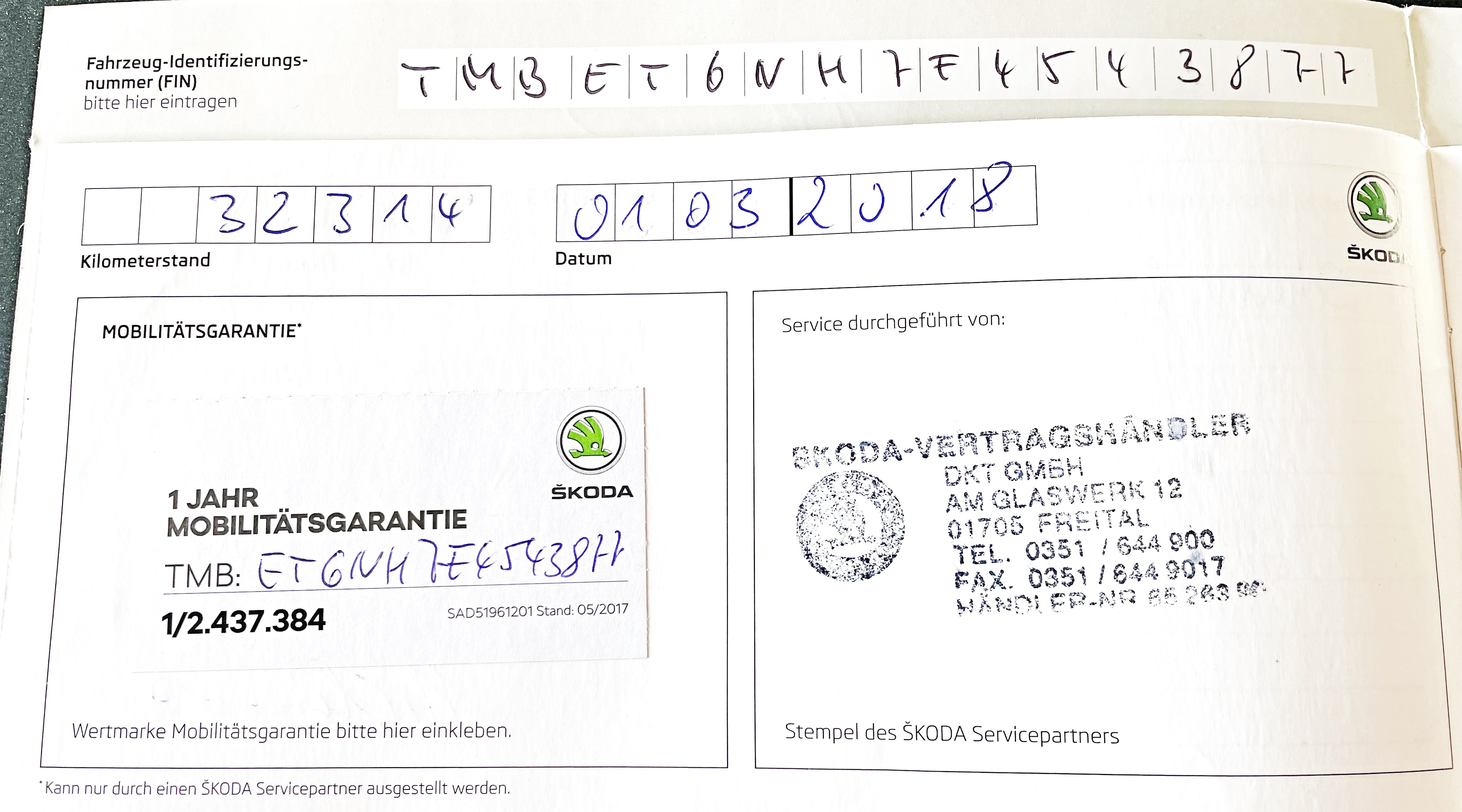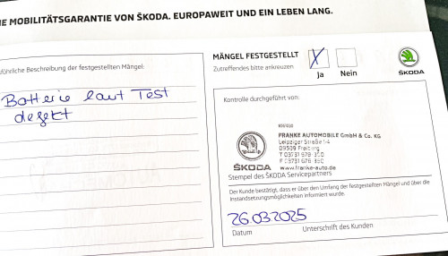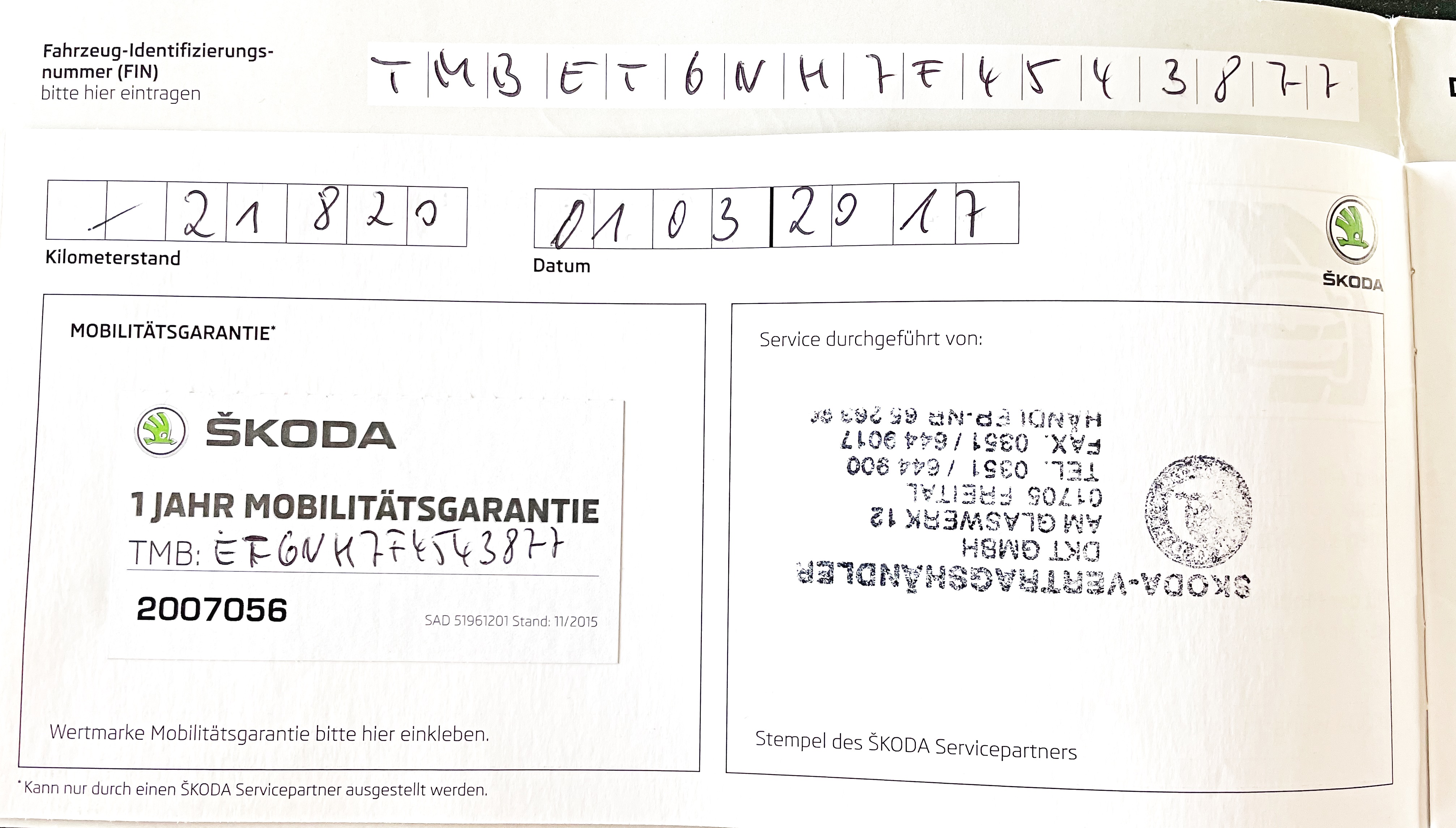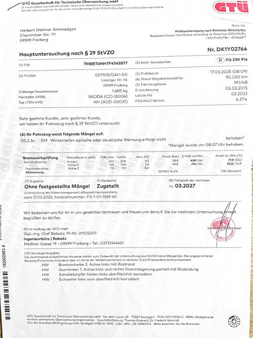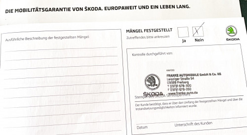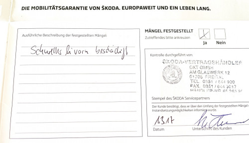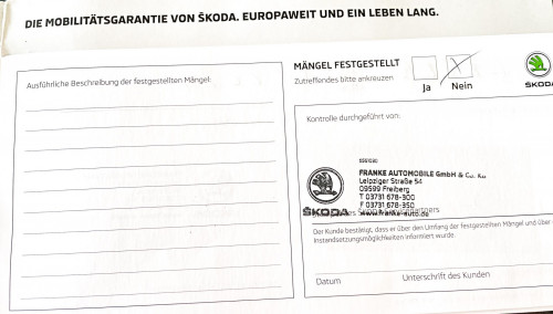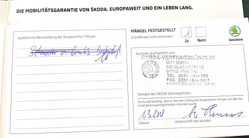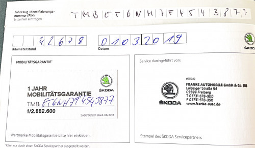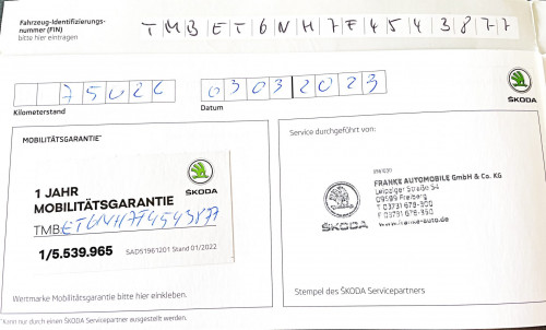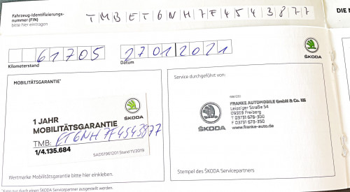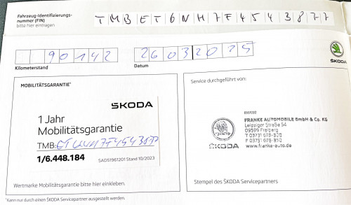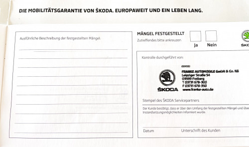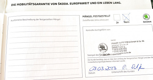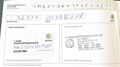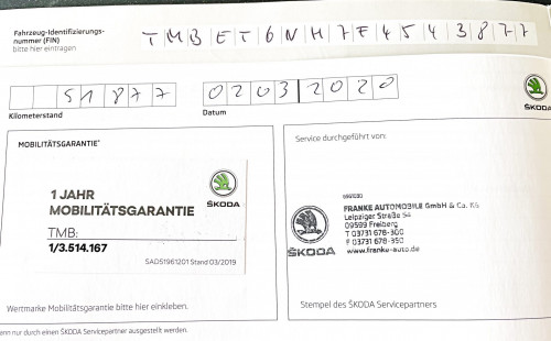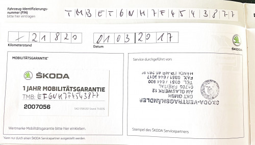 Vozidlo zakoupeno jako nové u autorizovaného dealera ŠKODA DKT GMBH ve Freitalu v Německu, jako ojeté u dealera Škoda Autohaus Franke Automobile GMBH ve Freibergu v Německu. Po celou dobu pravidelná údržba dle plánu výrobce Škoda a to do 26.3. 2025 pouze u autorizovaných dealerů Škoda DKT GMBH a Franke Automobile GMBH vždy s s roční mobilní garancí Škoda po kontrole všech 118bodů.