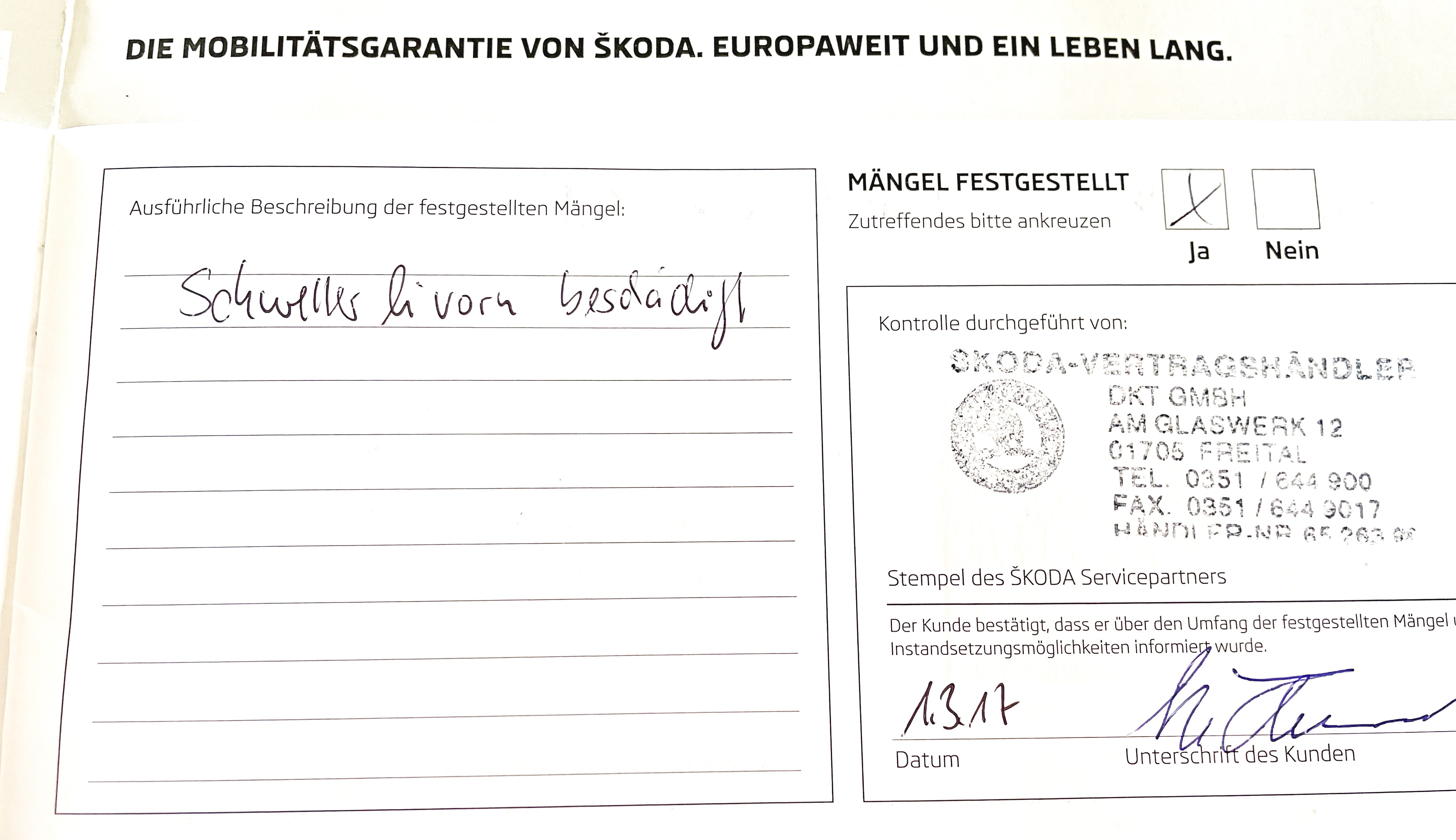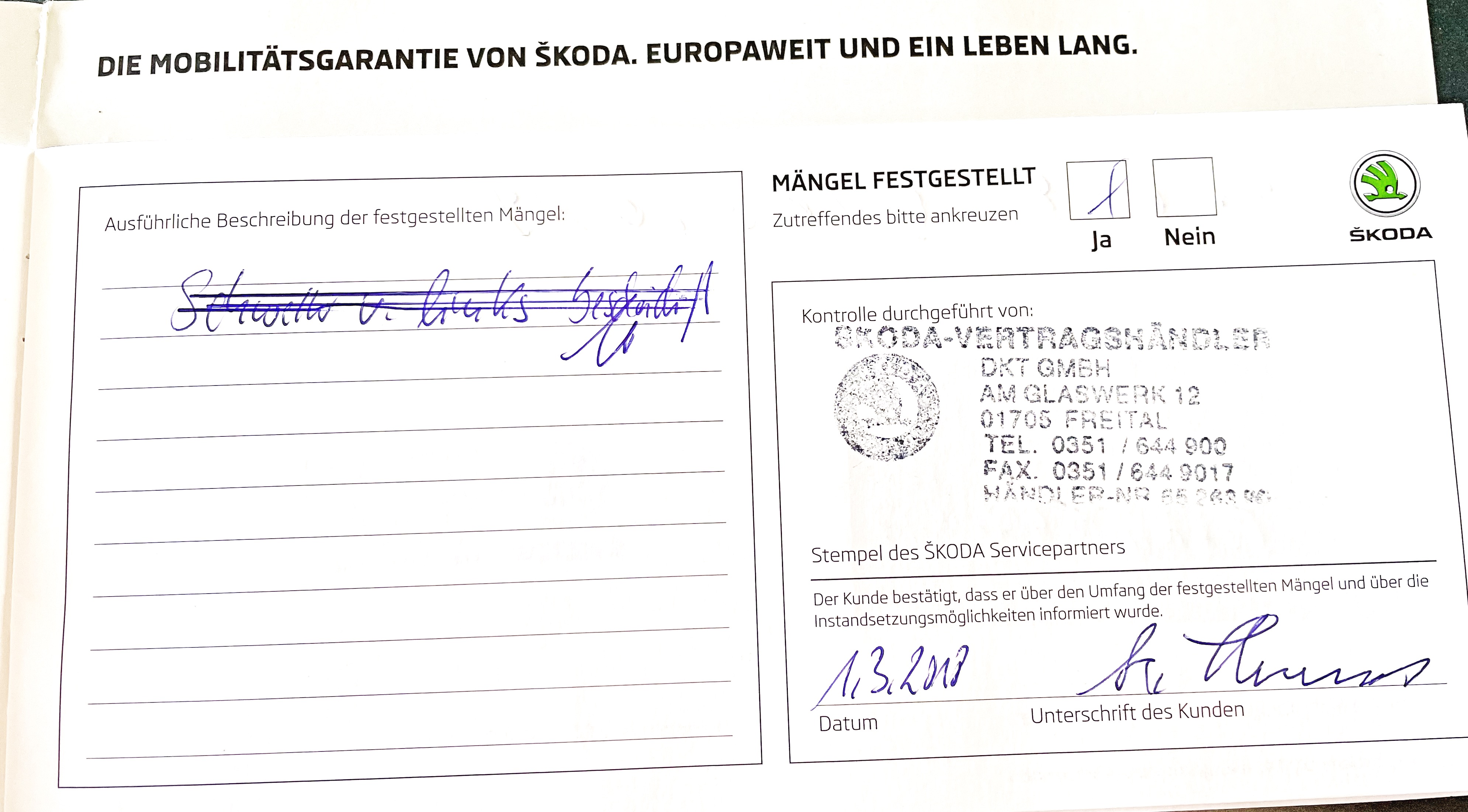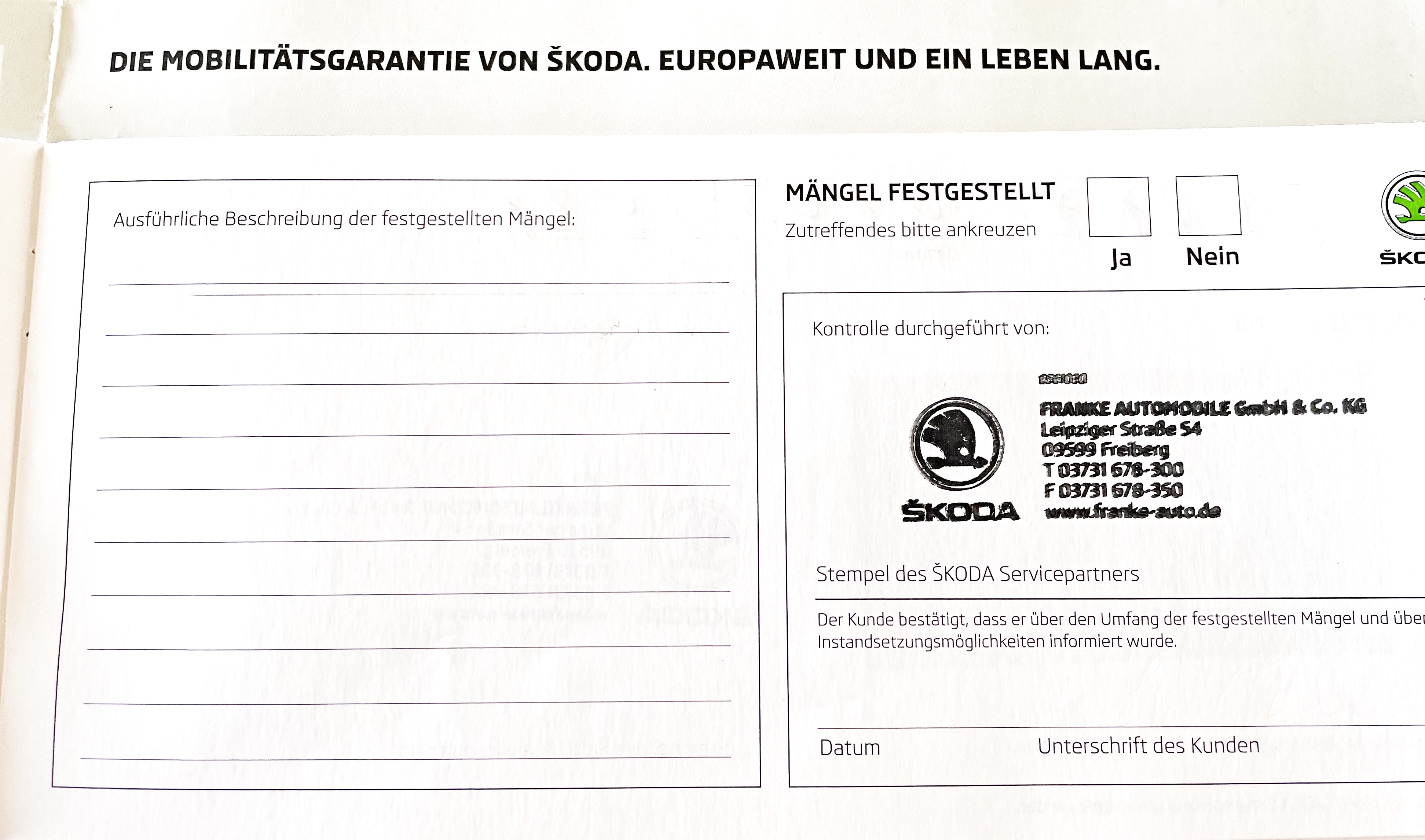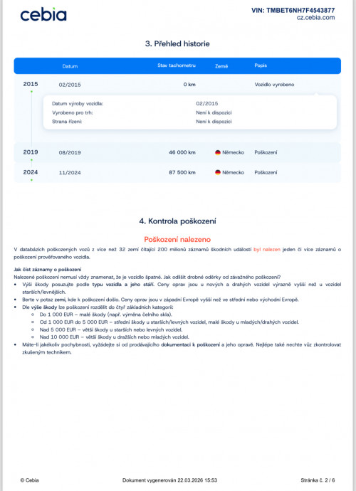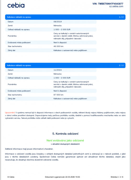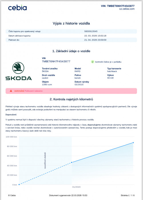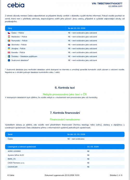 Vozidlo zakoupeno jako nové u autorizovaného dealera ŠKODA DKT GMBH ve Freitalu v Německu, jako ojeté u dealera Škoda Autohaus Franke Automobile GMBH ve Freibergu v Německu. Po celou dobu pravidelná údržba dle plánu výrobce Škoda a to do 26.3. 2025 pouze u autorizovaných dealerů Škoda DKT GMBH a Franke Automobile GMBH vždy s s roční mobilní garancí Škoda po kontrole všech 118bodů.