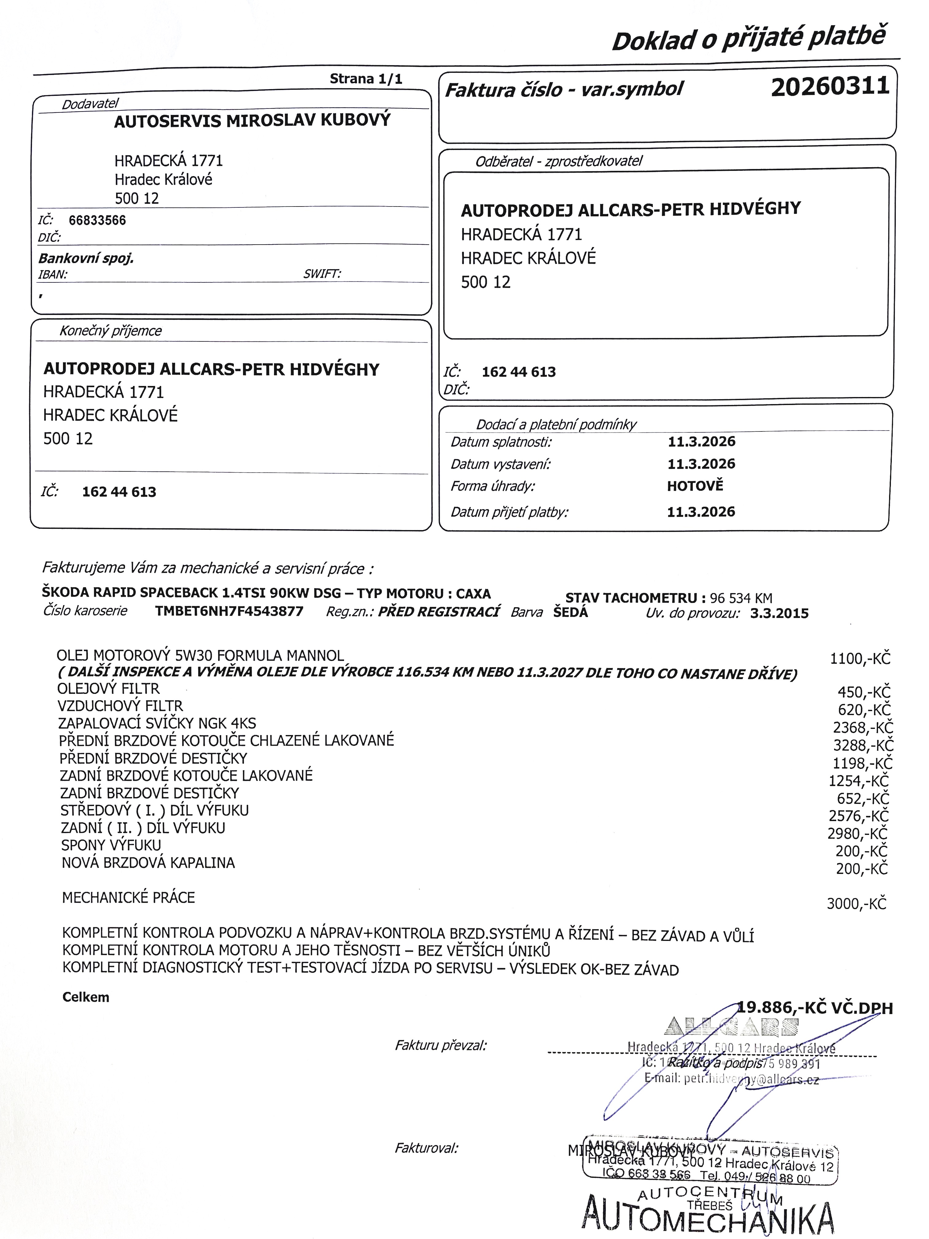NYNÍ PO KOMPLETNÍ PŘEDPRODEJNÍ KONTROLE A SERVISU VOZIDLA V NAŠEM SERVISNÍM ZÁZEMÍ V HRADCI KRÁLOVÉ DNE 11.3.2026 NA 96.534KM ZA 19.868,-KČ - KOMPLETNÍ VÝMĚNA PŘEDNÍCH I ZADNÍCH BRZDOVÝCH KOTOUČŮ A DESTIČEK+NOVÁ BRZDOVÁ KAPALINA+KOMPLETNÍ VÝMĚNA PŘEDNÍCHO I ZADNÍHO DÍLU VÝFUKU+NOVÉ VŠECHNY ZAPALOVACÍ SVÍČKY NGK+NOVÝ OLEJ V MOTORU+NOVÉ FILTRY ( OLEJ,VZDUCH+KONTROLA OSTATNÍCH - NEDÁVNO MĚNĚNY) KOMPLETNÍ MECHANICKÁ KONTROLA PODVOZKU, NÁPRAV, VŮLÍ A ŘÍZENÍ+KONTROLA MOTORU A TĚSNOSTI+KOMPLETNÍ DIAGNOSTIKA VOZIDLA - FAKTURA A GARANCE VŠECH ÚKONŮ DO SMLOUVY PŘI PRODEJI.