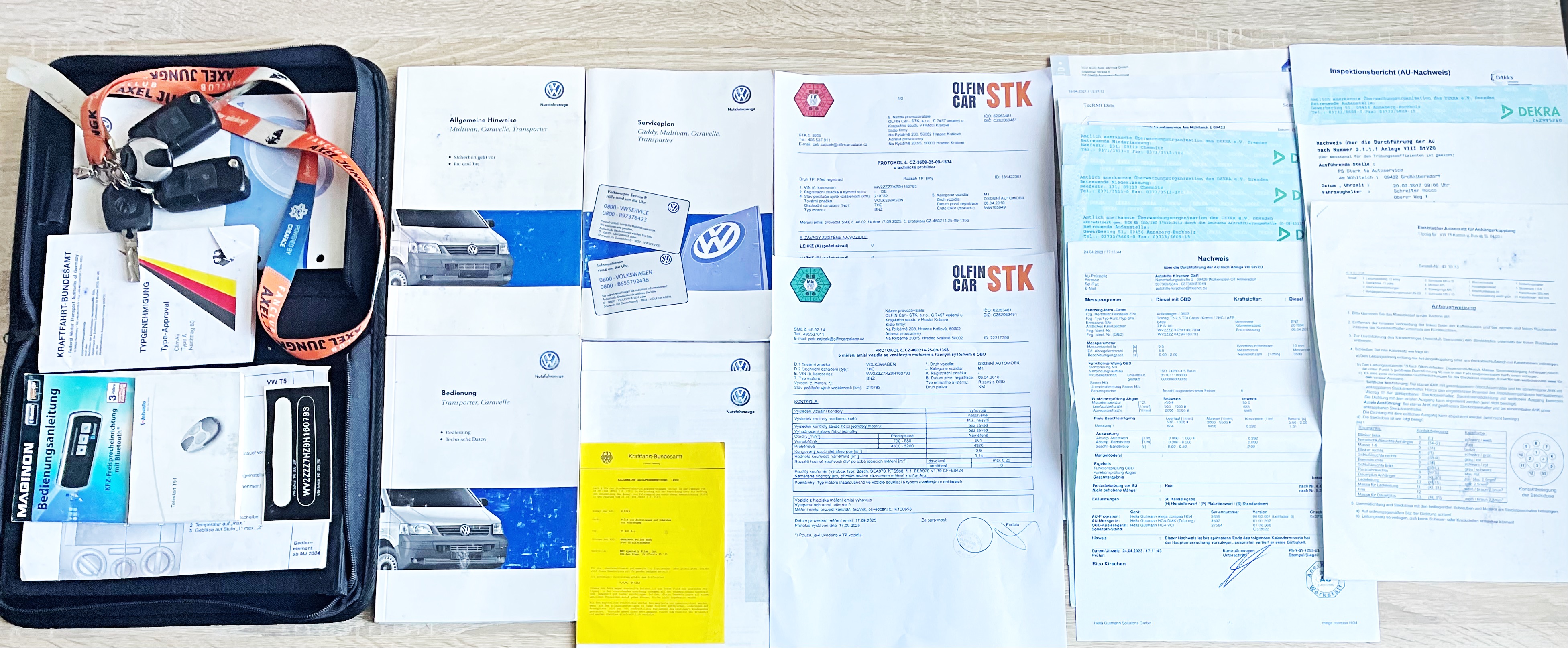 SERVISNÍ KNIHA+PROTOKOLY DEKRA A TÜV ZA NĚKOLIK POSLEDNÍ STK Z NĚMECKA+VEŠKERÁ PALUBNÍ LITERATURA VW K OBSLUZE A ÚDRŽBĚ VOZU+DALŠÍ DOKLADY Z NĚMECKA+PROTOKOLY Z STK V ČR+FAKTURA ZA POSLEDNÍ SERVIS V ČR